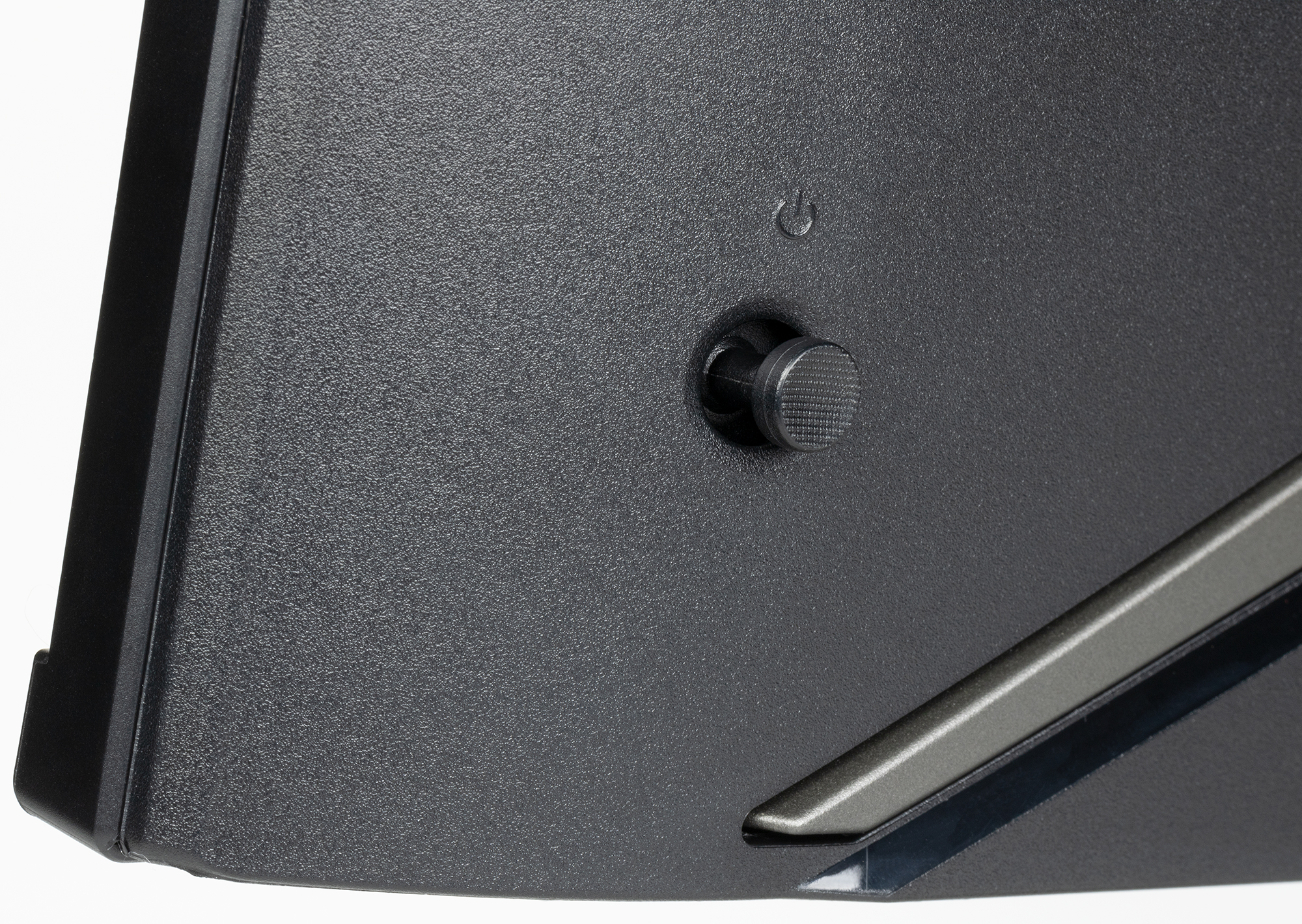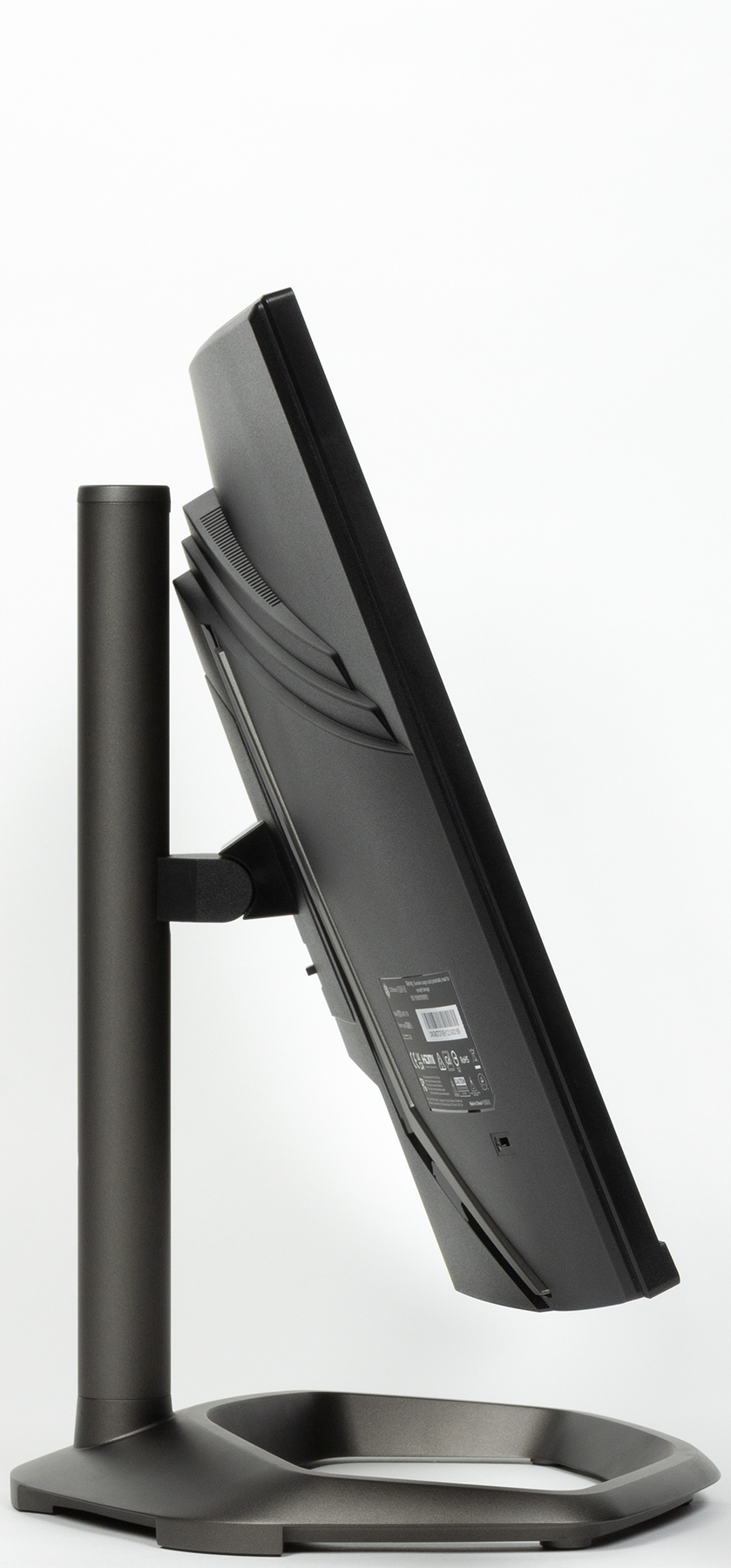 Дизайн подставки примечателен тем, что контур основания повторяет контур логотипа производителя. Выполненные из алюминиевого сплава основание, стойка и часть крепежного узла блока экрана анодированы и покрашены в темно-серый серебристый цвет. Цилиндрическая стойка — это цельнометаллическая профилированная труба. Стойка имеет фиксированную высоту, но подпираемый пружиной механизм обеспечивает вертикальное перемещение узла, на который крепится блок экрана. На этом узле закреплены ролики, которые перемещаются по направляющим внутри стойки. В итоге экран легким движением руки можно установить на нужную высоту. Шарнир в крепежном узле позволяет немного наклонять блок экрана вперед от вертикального положения и больше — назад.