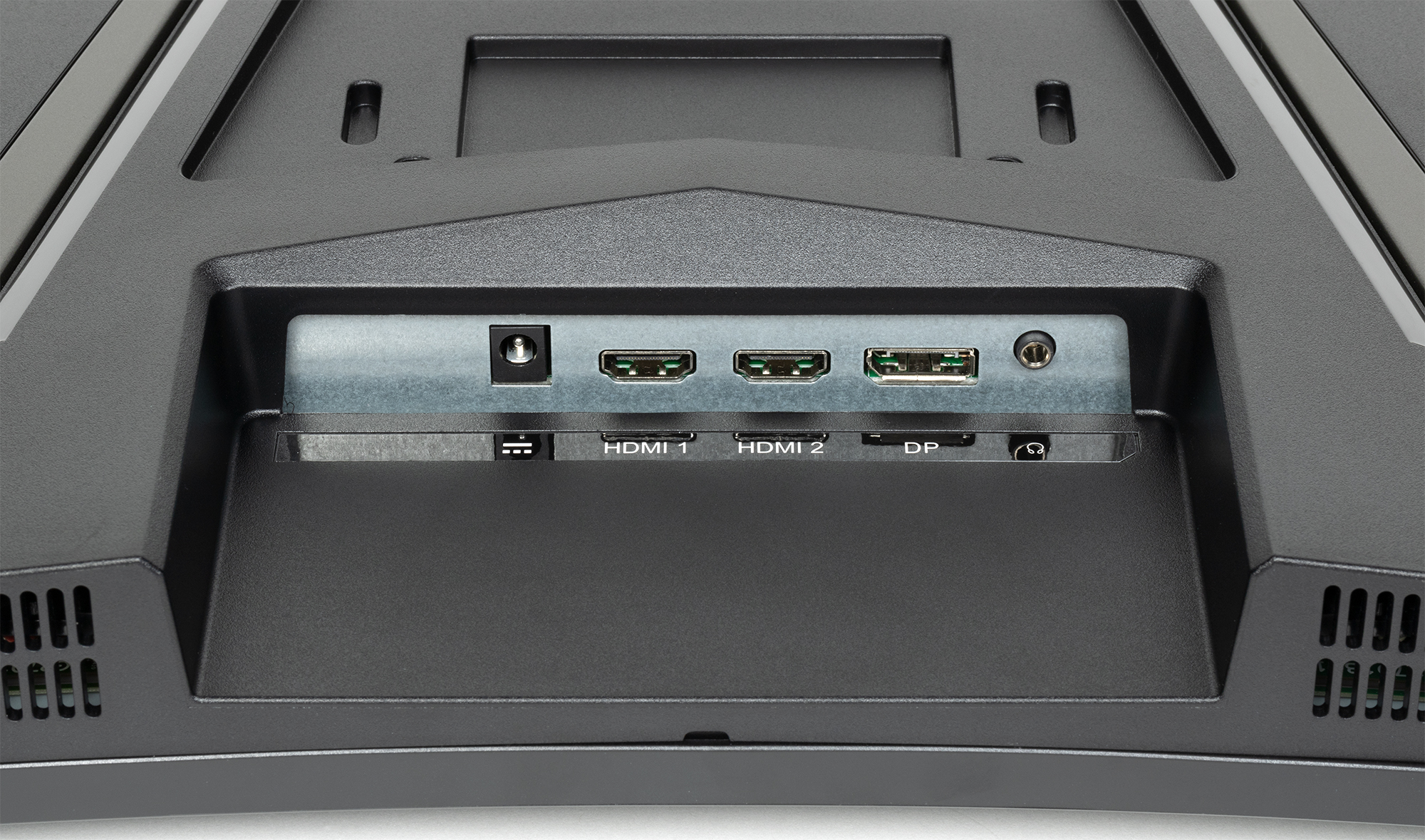 Дизайн строгий, игровую направленность в явном виде ничего не выдает. Панели блока экрана и кожухи узла крепления блока экрана изготовлены из черного пластика в основном с матовой поверхностью. Внешняя поверхность матрицы черная, полуматовая (зеркальность хорошо выражена), внешний слой матрицы жесткий. Плоскость экрана изогнута по цилиндру так, что правый и левый край немного выдвинуты вперед. Заявленный радиус изгиба равен 1,5 м. Равномерность кривизны экрана у данной модели хорошая, правда в вертикальной полосе шириной порядка 10 см у правого и левого края экран практически плоский, но это характерно для всех изогнутых ЖК-экранов. Спереди экран выглядит как монолитная поверхность, ограниченная снизу неширокой планкой, а по периметру — узкой окантовкой. Выведя изображение на экран, можно увидеть, что на самом деле между внешними границами экрана и собственно областью отображения есть неширокие поля.