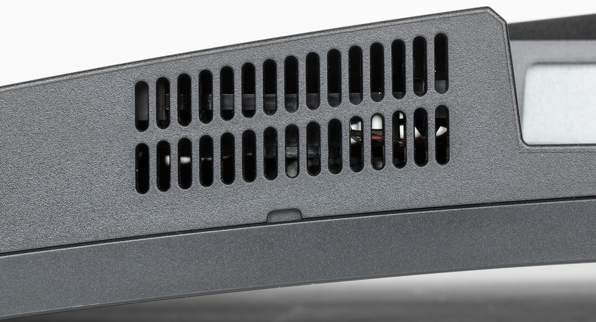 На нижнем торце и в верхней части на задней панели есть вентиляционные решетки. За решетками на нижнем торце размещены два бокса с крохотными громкоговорителями.