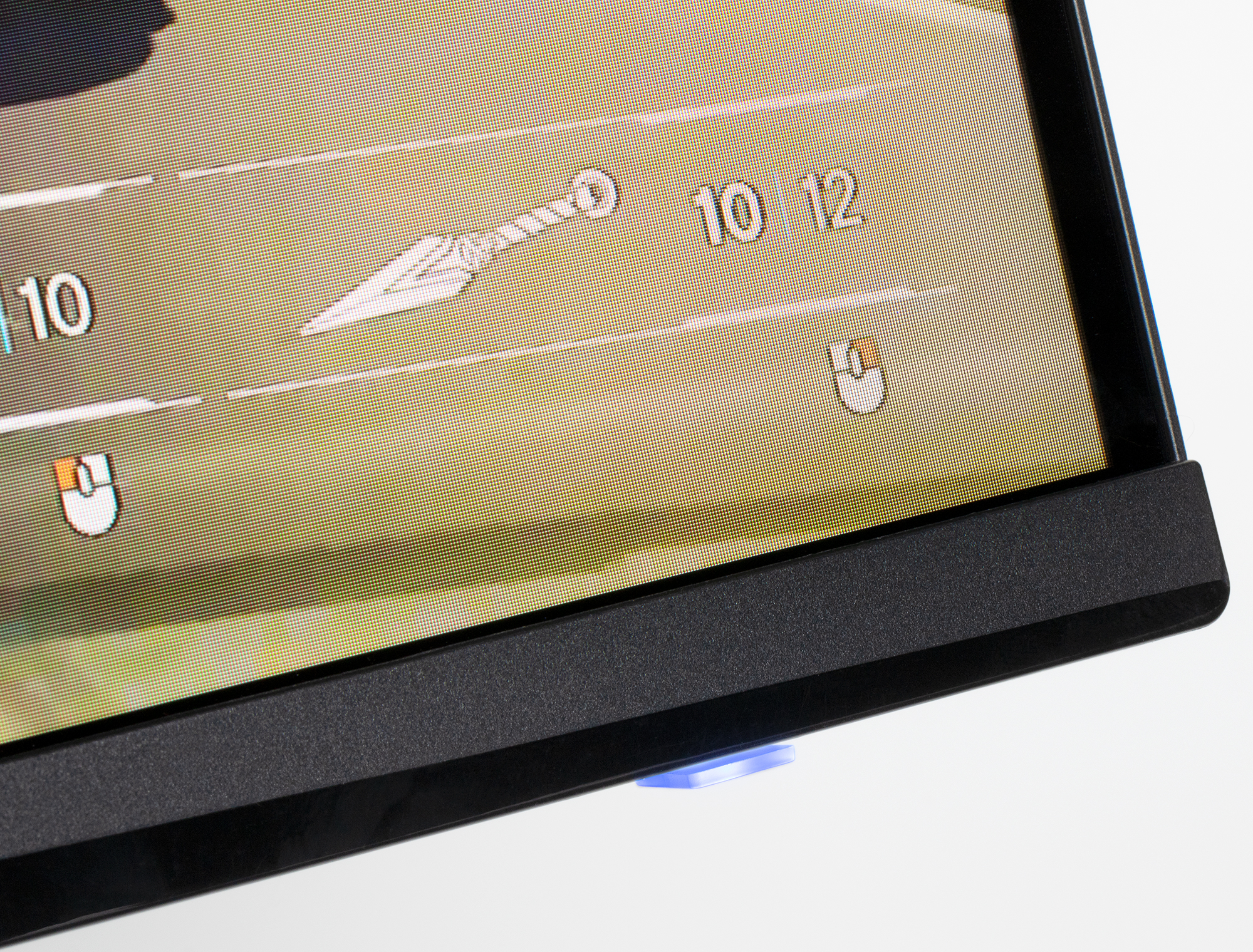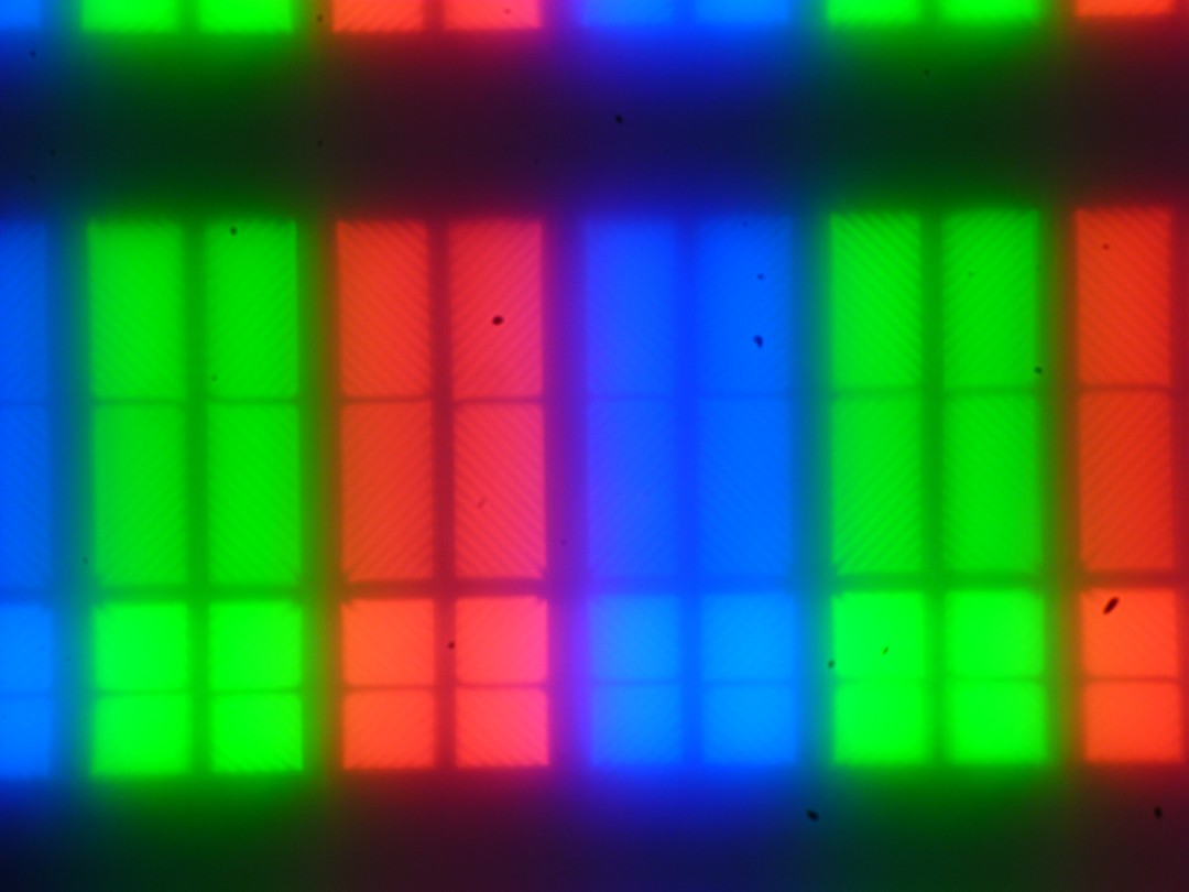 Четкое изображение структуры пикселей из-за матовой поверхности получить не удается, впрочем, при желании на фрагменте ниже можно разглядеть типичную для VA структуру в виде параллельных полосок. Субпиксели трех цветов (красного, зеленого и синего) поделены на две различающиеся по площади и независимо управляемые области, каждая из которых разделена на четыре участка с доменами в различающейся ориентации. Такое сложное устройство в принципе способно обеспечить широкий динамический диапазон по количеству оттенков, так как с ростом яркости области включаются последовательно, и хорошие углы обзора, чему способствует вариация ориентации ЖК в доменах (черные точки — это пыль на матрице фотоаппарата):