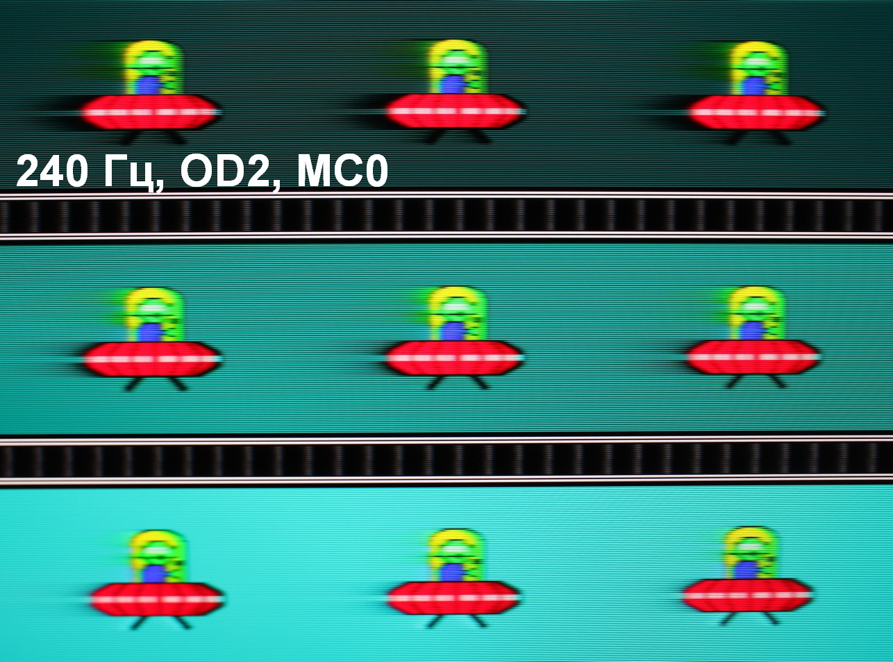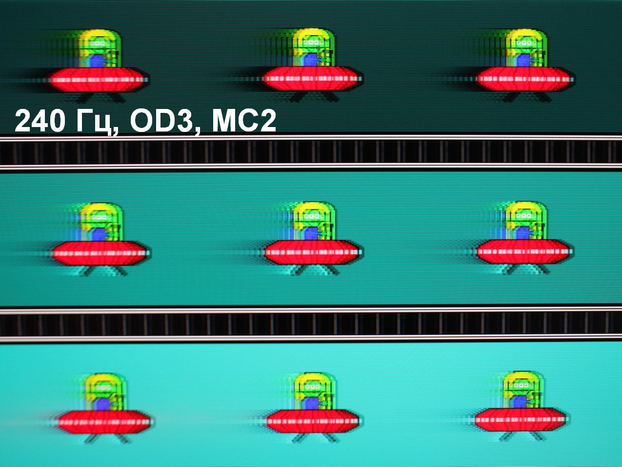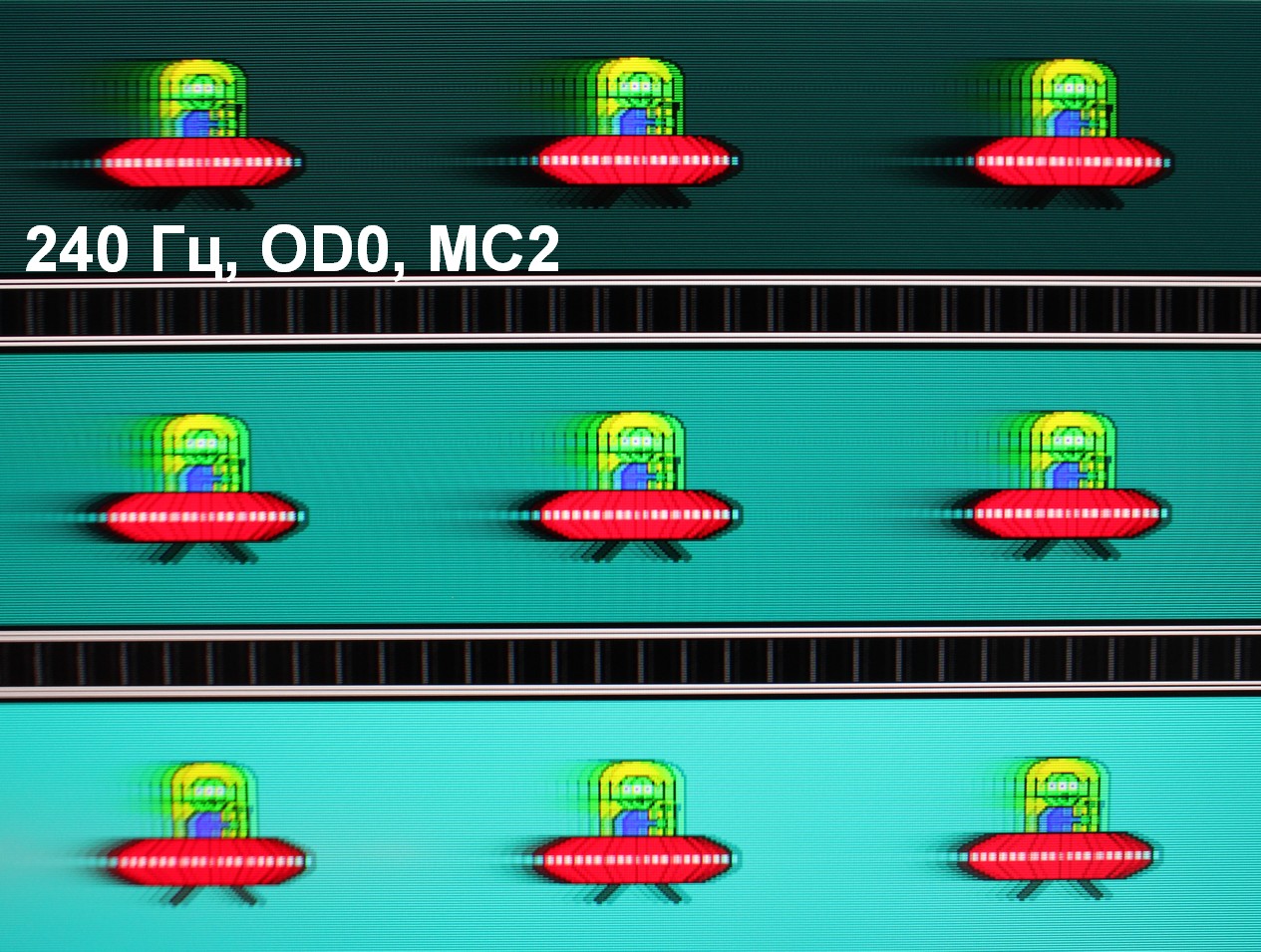 Для наглядного представления о том, что на практике означает такая скорость матрицы, какие могут быть артефакты от разгона и повышает ли четкость в движении, описанная выше настройка Motion Clearness, приведем серию снимков, полученных с помощью движущейся камеры. Такие снимки показывают, что видит человек, если он следит глазами за двигающимся на экране объектом. Описание теста приведено тут, страница с самим тестом тут. Использовались рекомендованные установки (скорость движения 960 пиксель/с для частот обновления 60, 120 и 240 Гц), выдержка 1/15 с, на фотографиях указаны значения частоты обновления, а также ступень разгона (ODx) и ступень режима Motion Clearness (MCx).