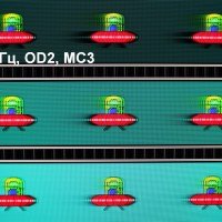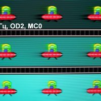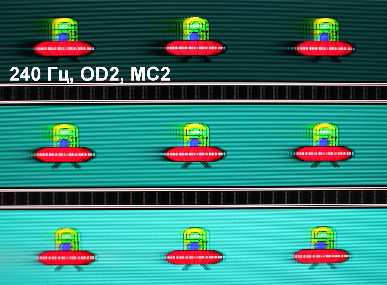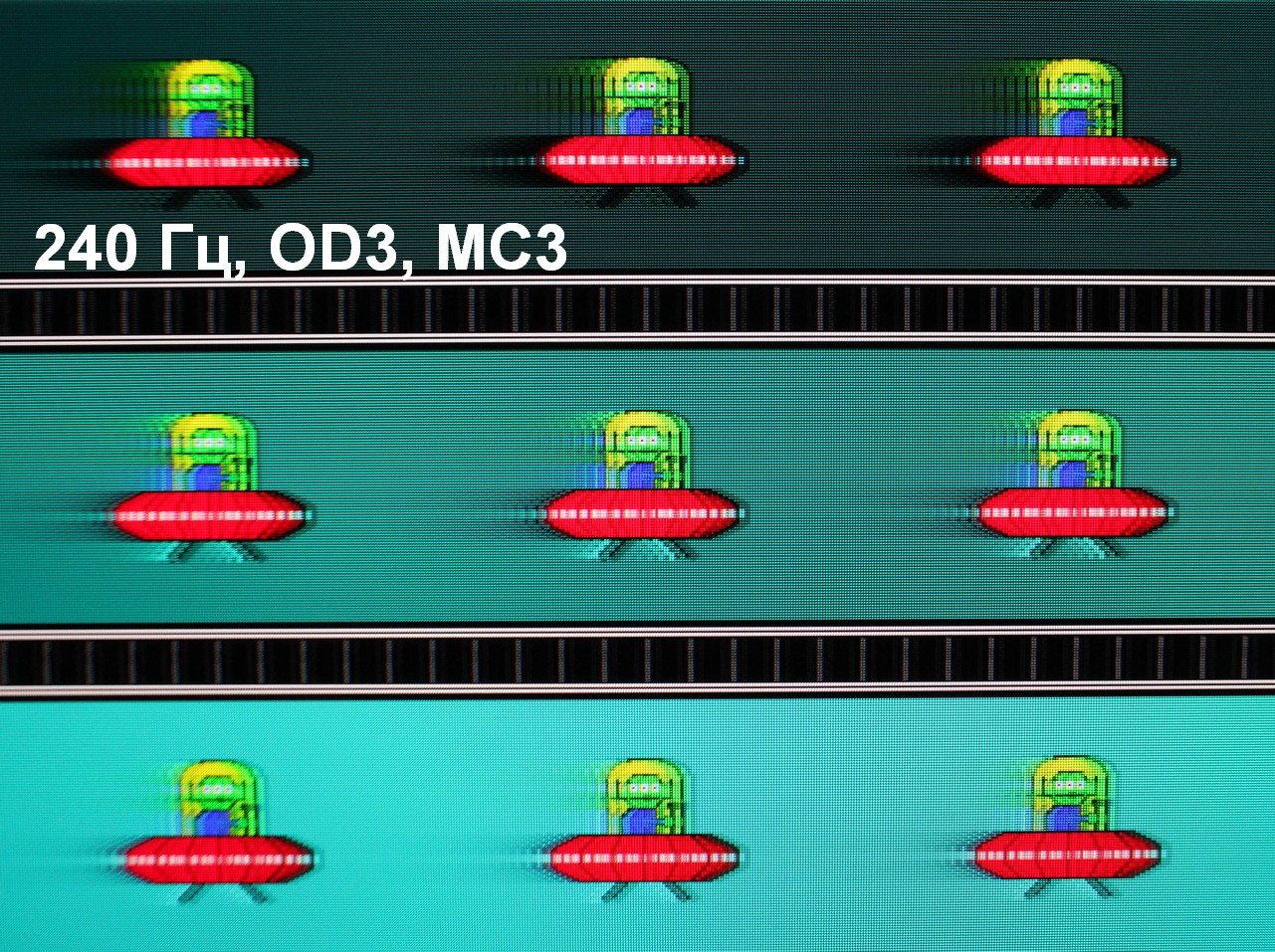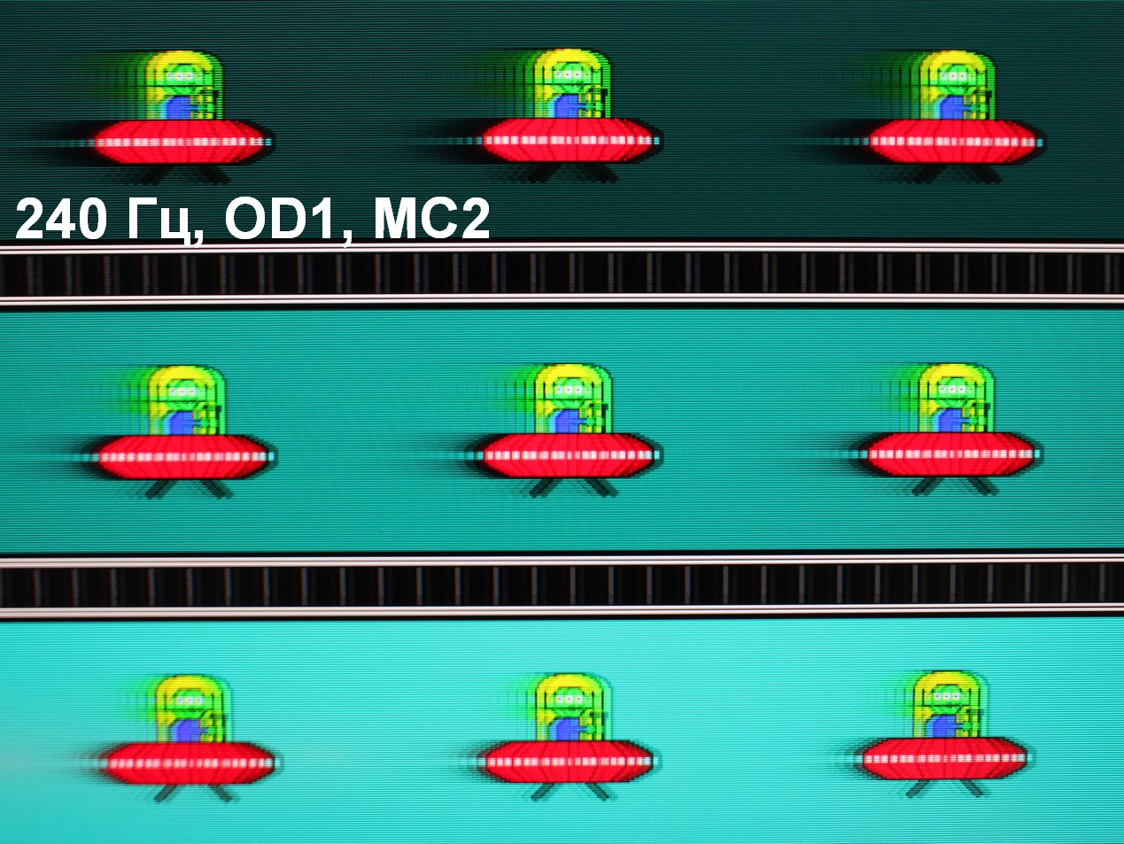 Для наглядного представления о том, что на практике означает такая скорость матрицы, какие могут быть артефакты от разгона и повышает ли четкость в движении, описанная выше настройка Motion Clearness, приведем серию снимков, полученных с помощью движущейся камеры. Такие снимки показывают, что видит человек, если он следит глазами за двигающимся на экране объектом. Описание теста приведено тут, страница с самим тестом тут. Использовались рекомендованные установки (скорость движения 960 пиксель/с для частот обновления 60, 120 и 240 Гц), выдержка 1/15 с, на фотографиях указаны значения частоты обновления, а также ступень разгона (ODx) и ступень режима Motion Clearness (MCx).