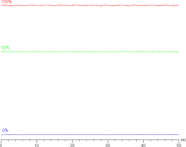 На любом уровне яркости модуляция подсветки отсутствует, что исключает видимое мерцание экрана. Для тех, кто привык распознавать знакомое сокращение, уточним: ШИМ отсутствует. В доказательство приведем графики зависимости яркости (вертикальная ось) от времени (горизонтальная ось) при различных значениях настройки яркости: