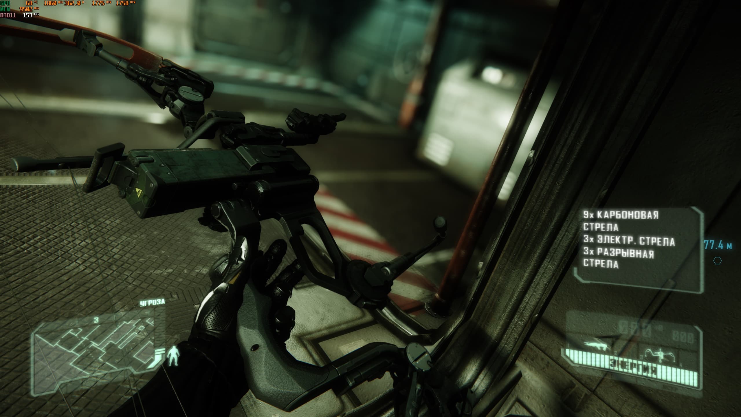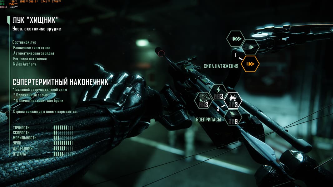 Эти же стрелы помогают устранять пулеметы и лазерные ловушки. Главное — чтобы стрела долетела, а для этого есть выбор силы натяжения. По-началу нам будет доступна только карбоновая стрела, чтобы скрытно устранить солдата, не потратив при этом запас патронов другого орудия.