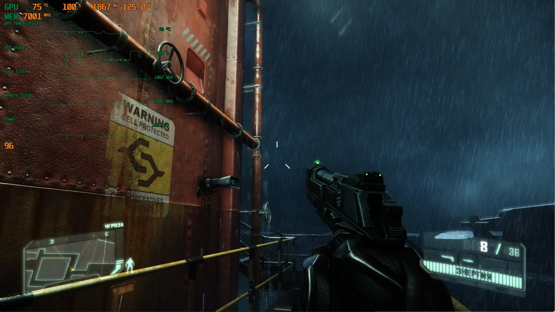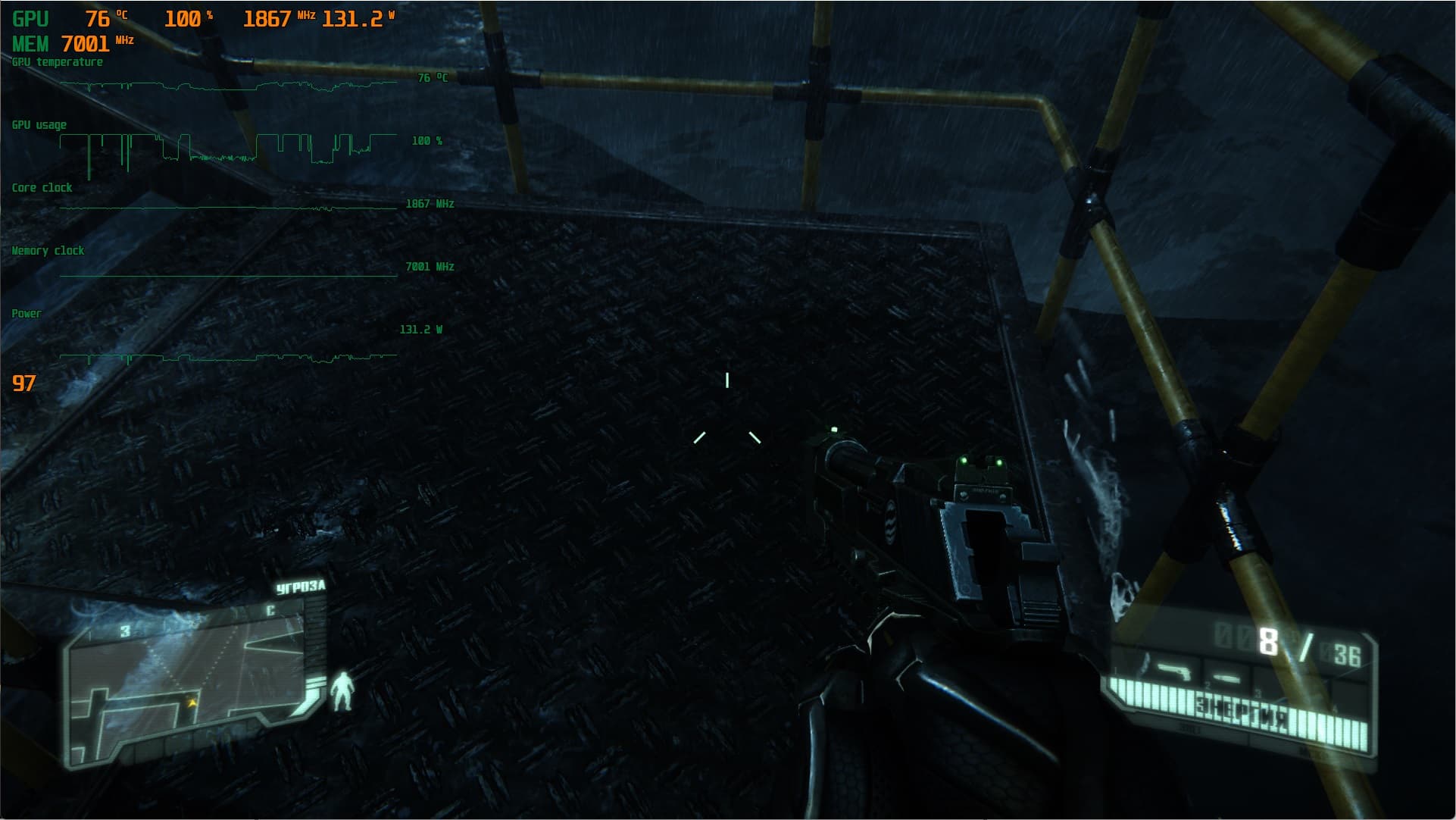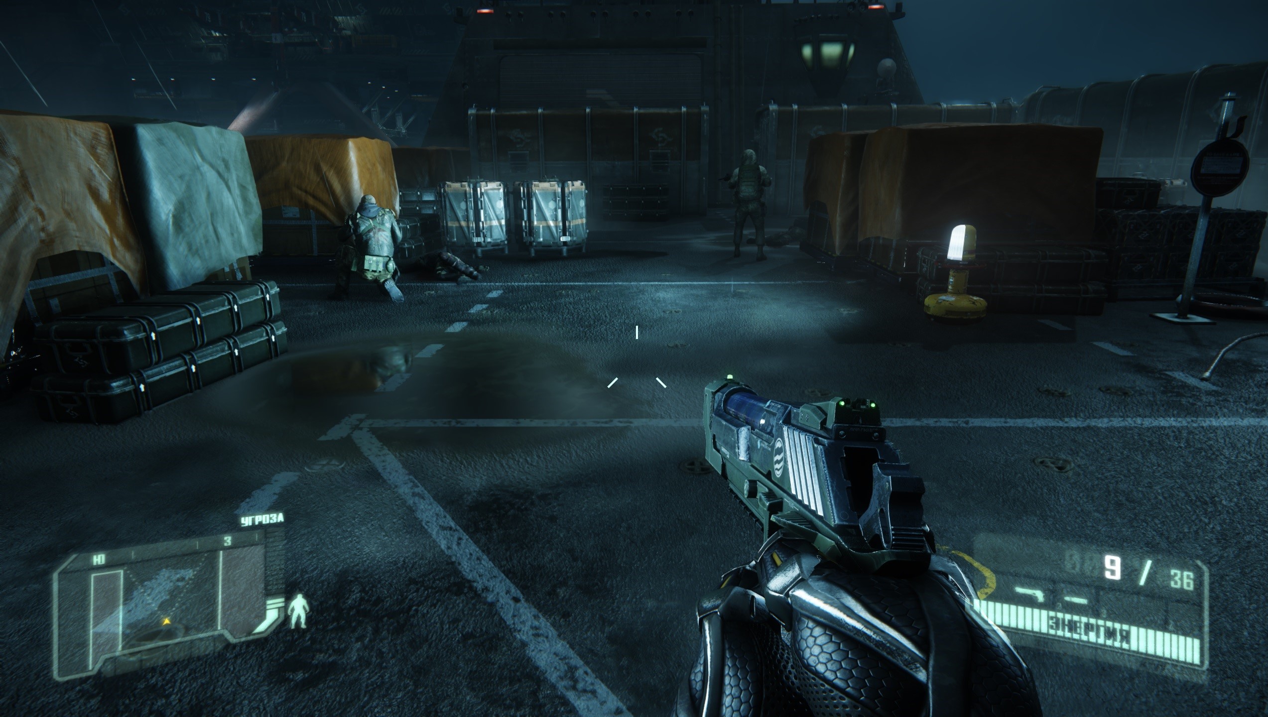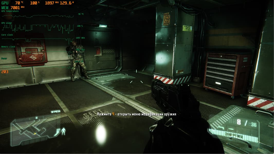 Защита — когда этот режим активен, то костюм становится очень крепкой бронёй, способной защитить носителя от пуль, осколков и даже взрывов. По мере использования энергия тратится.