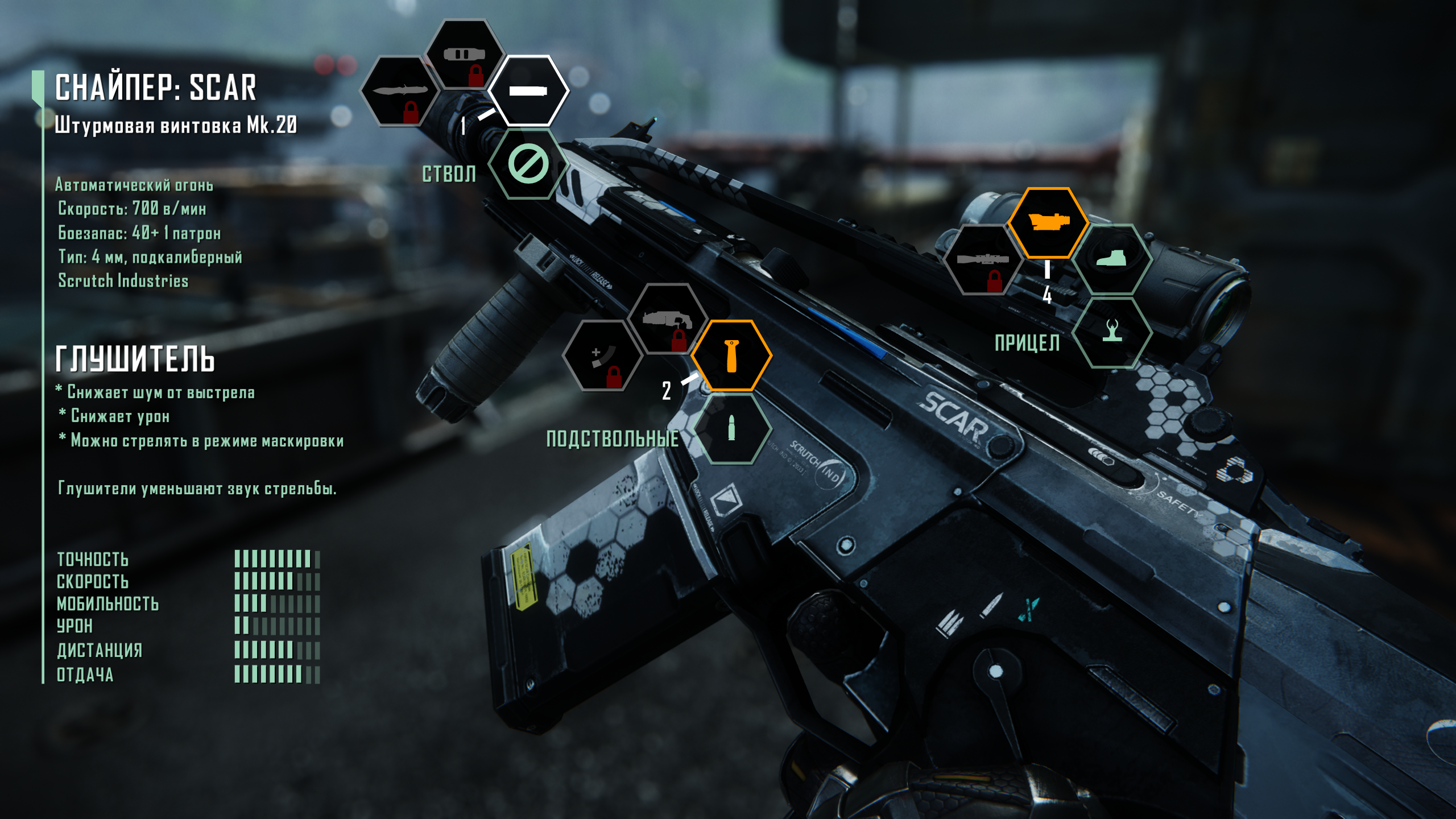 Штурмовая винтовка SCAR. Оружие с глушителем действительно истощает энергию при стрельбе, но делает это медленно. Пистолеты с глушителем могут делать то же самое. В любом случае глушители на орудиях могут оказаться хорошей альтернативой, если в луке не хватает стрел.