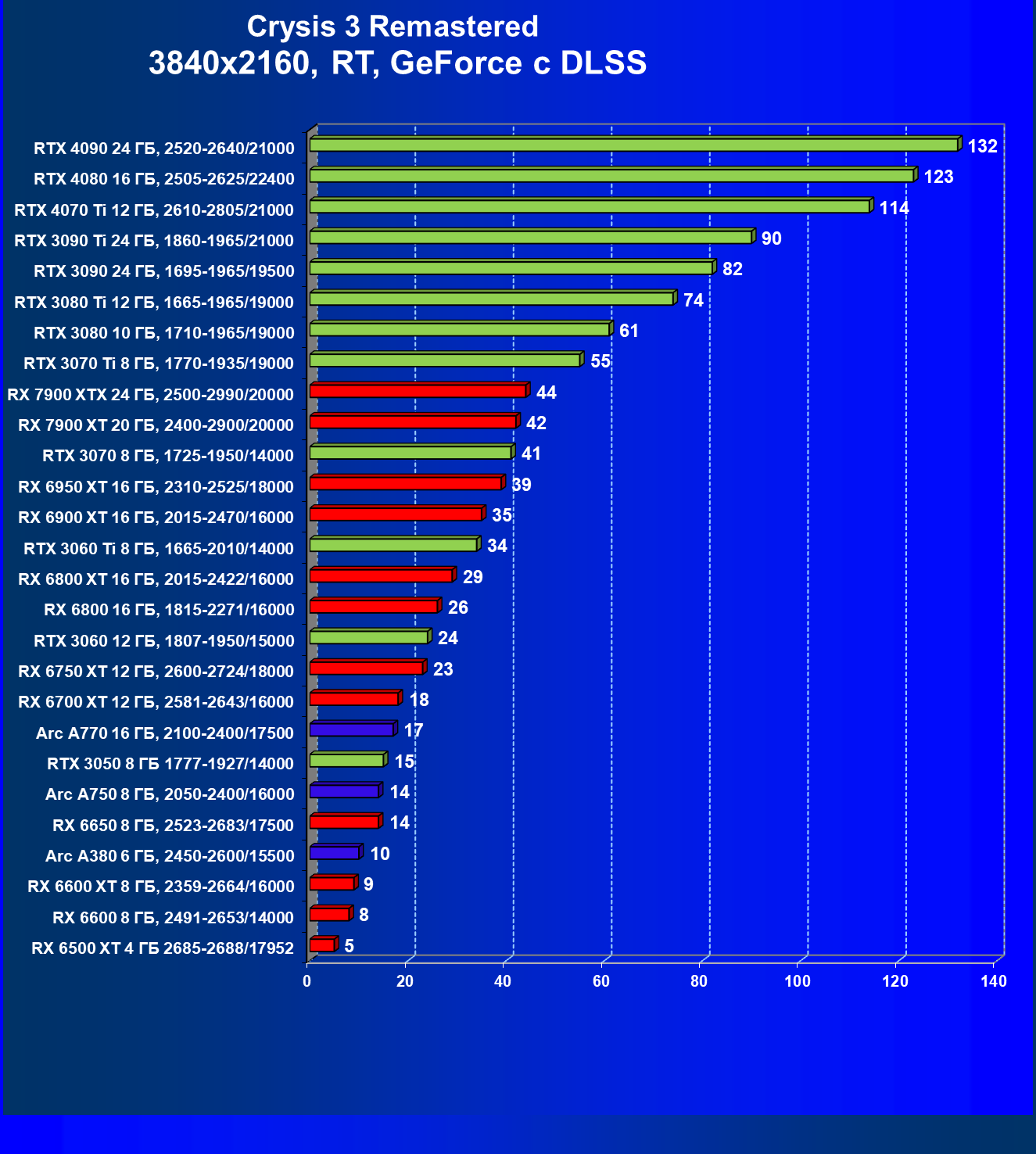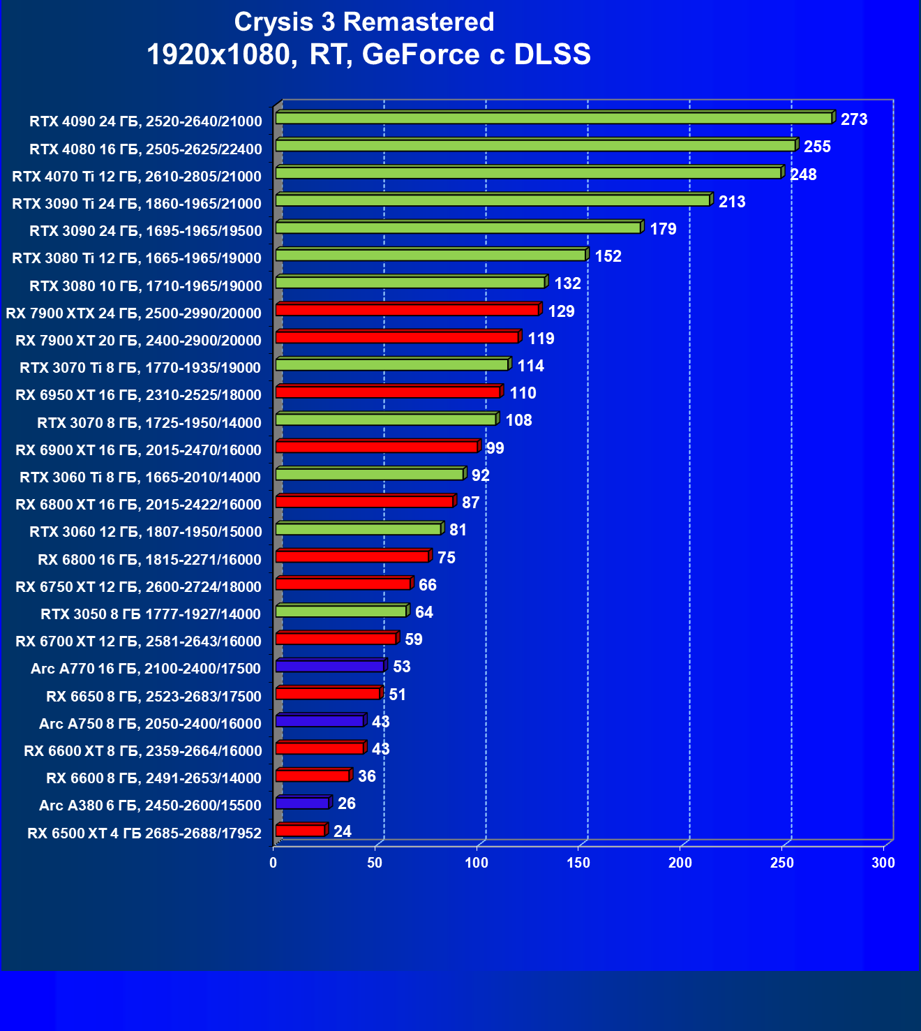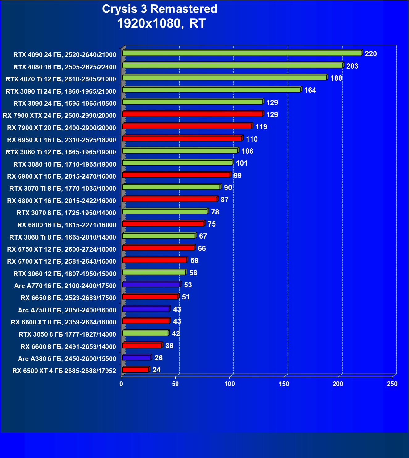 Если рассматривать самое популярное разрешение Full HD, то для того, чтобы играть на максимальных настройках графики без трассировки лучей, нужно вооружиться GeForce RTX 3050, Radeon RX 6600 или Intel Arc 750. В разрешении 2.5K достаточную производительность обеспечат GeForce RTX 3070, Radeon RX 6800 XT и Intel Arc 770. В разрешении 4К для комфорта потребуется GeForce RTX 3070 Ti или Radeon RX 6900 XT.