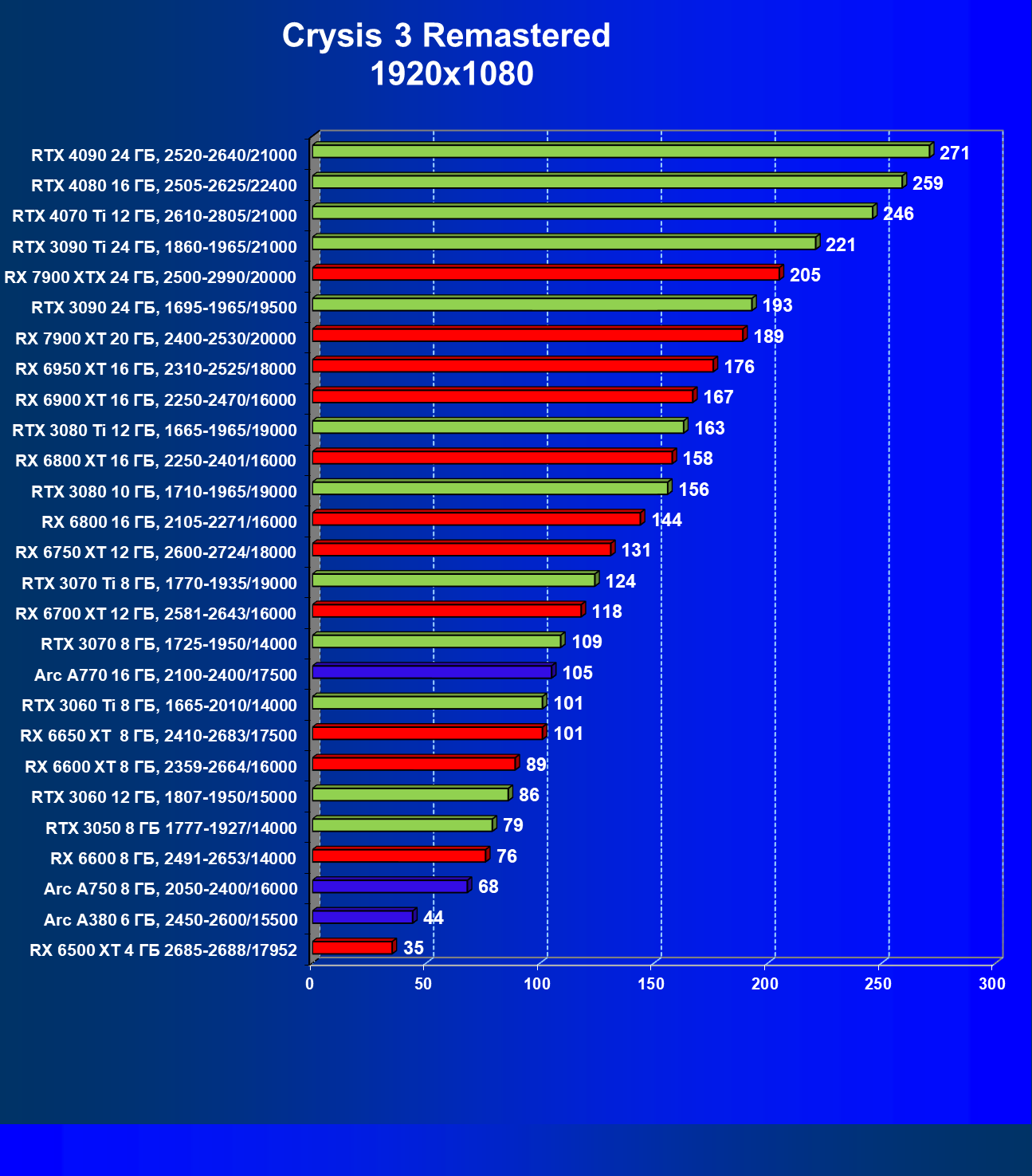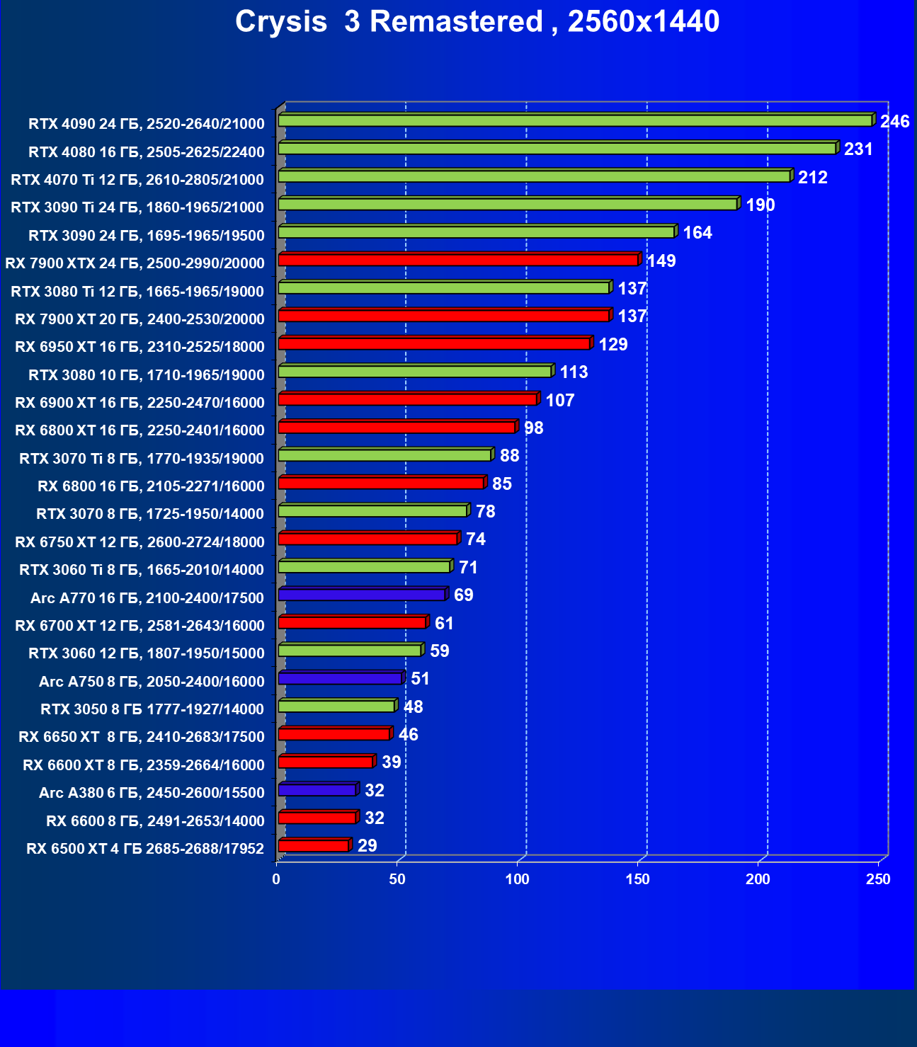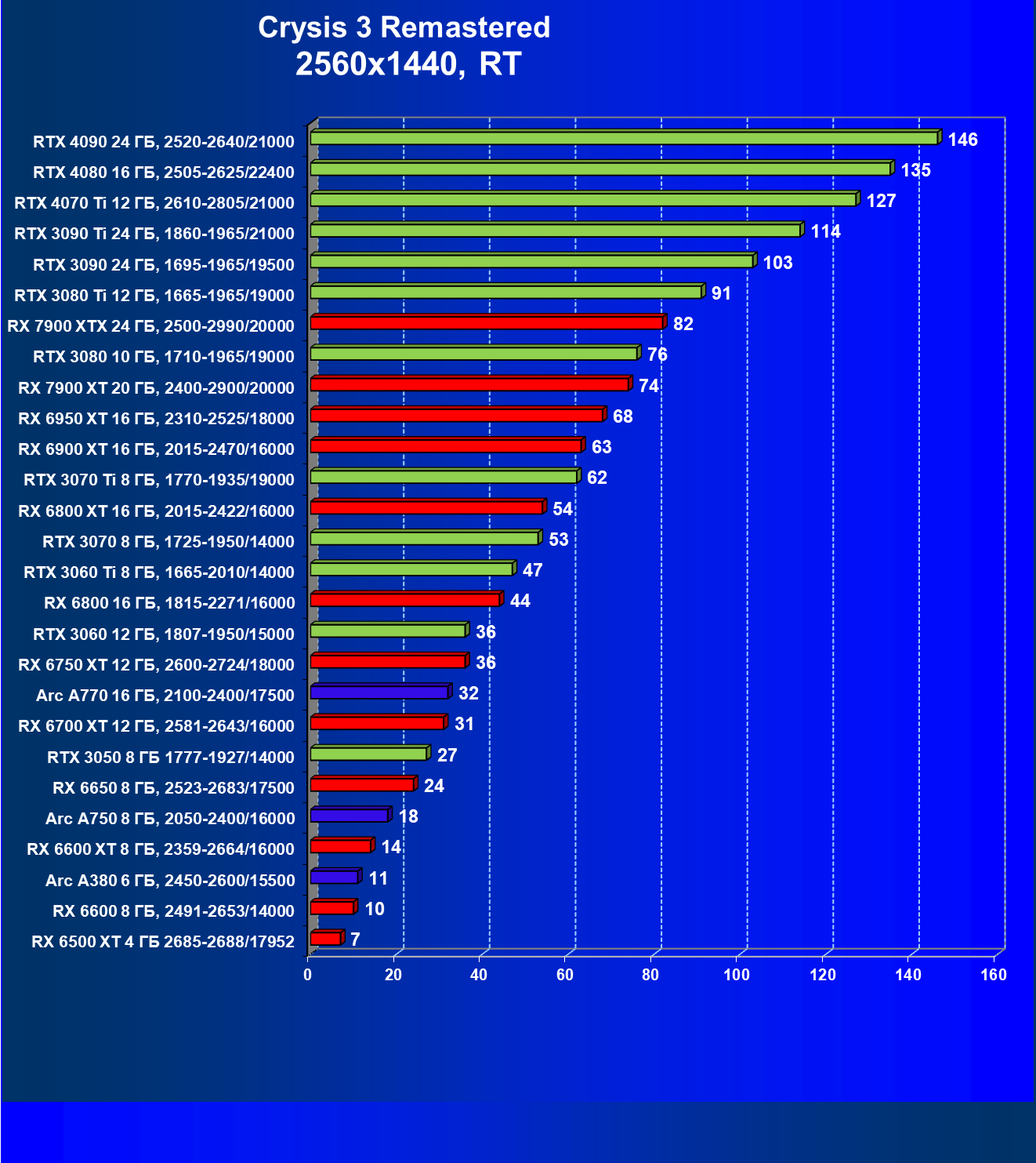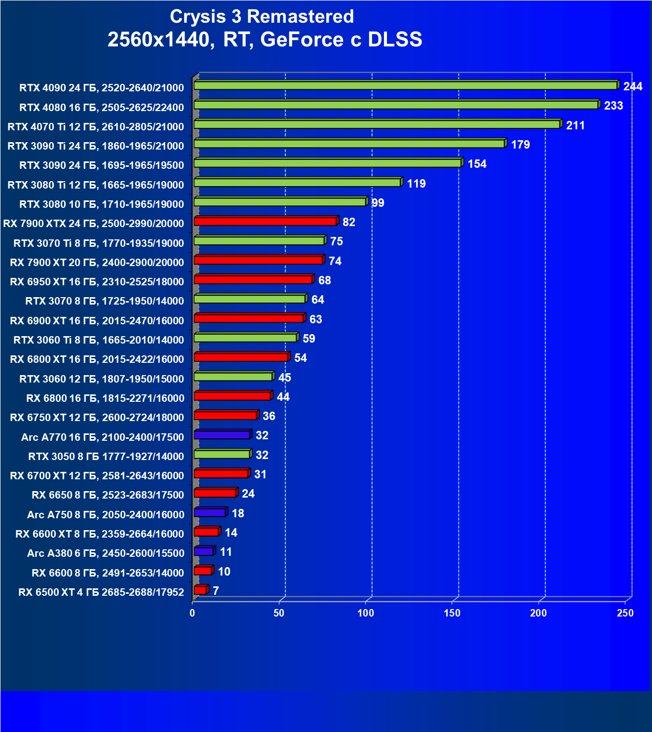Если рассматривать самое популярное разрешение Full HD, то для того, чтобы играть на максимальных настройках графики без трассировки лучей, нужно вооружиться GeForce RTX 3050, Radeon RX 6600 или Intel Arc 750. В разрешении 2.5K достаточную производительность обеспечат GeForce RTX 3070, Radeon RX 6800 XT и Intel Arc 770. В разрешении 4К для комфорта потребуется GeForce RTX 3070 Ti или Radeon RX 6900 XT.
