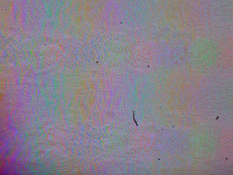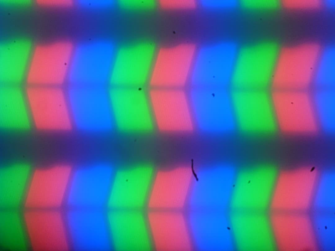 На микрофотографии ниже можно разглядеть типичную для IPS структуру в виде параллельных полосок, а также, что каждый субпиксель делится на два примерно равных домена (черные точки — это пыль на матрице фотоаппарата):