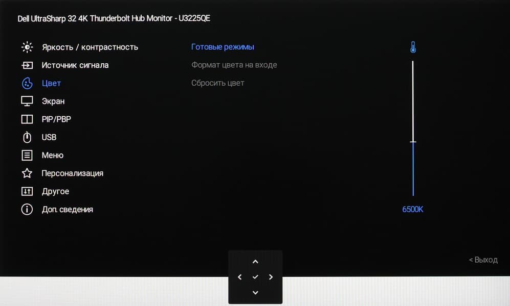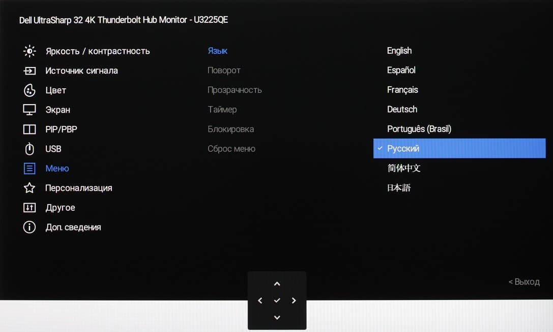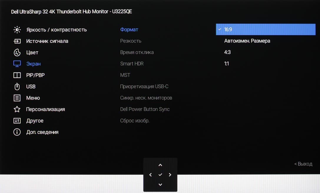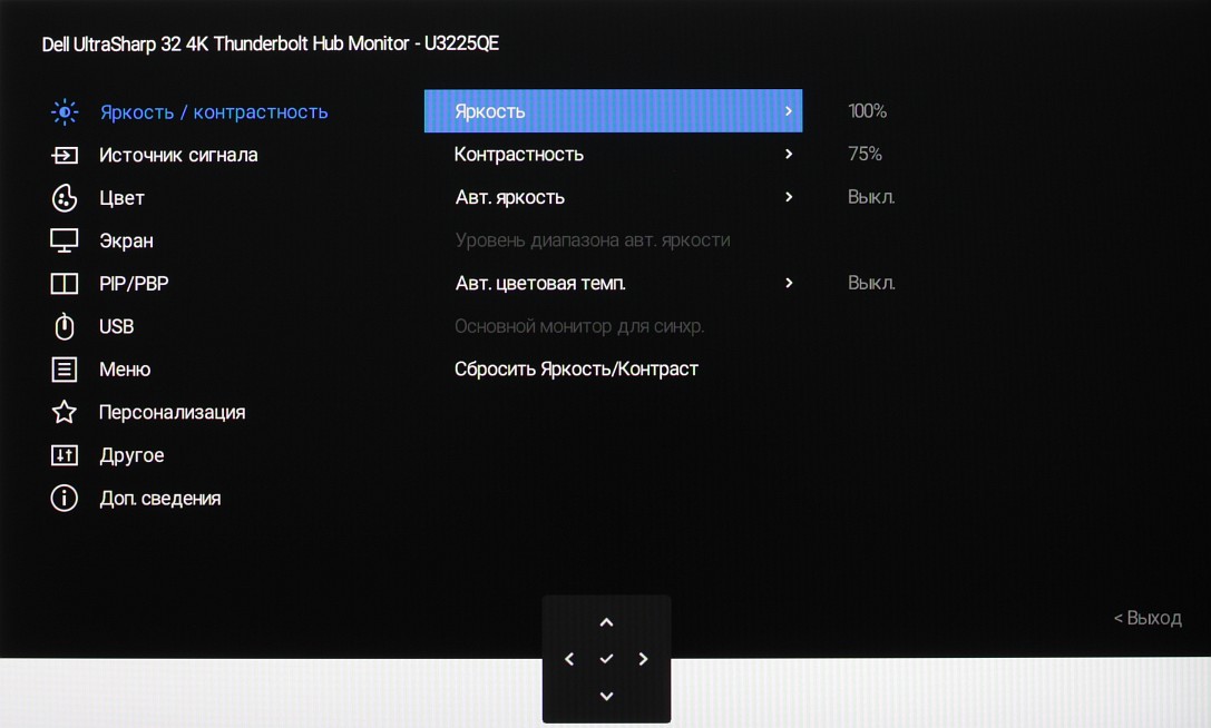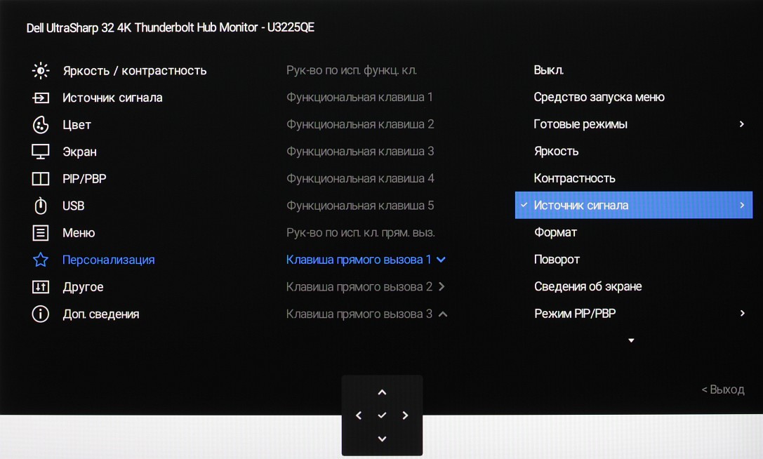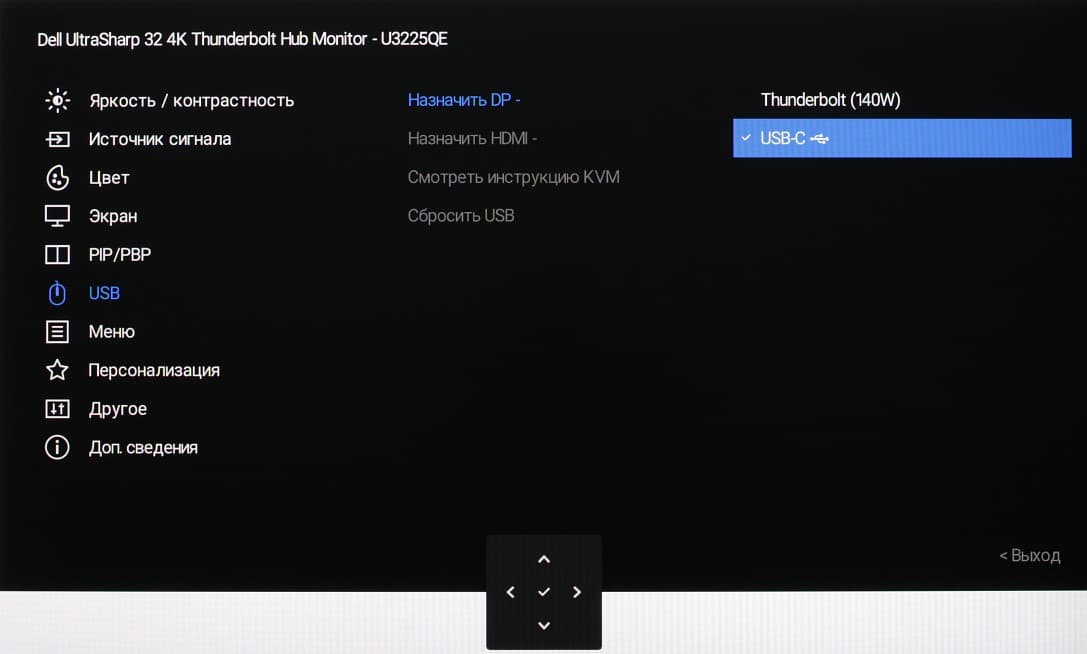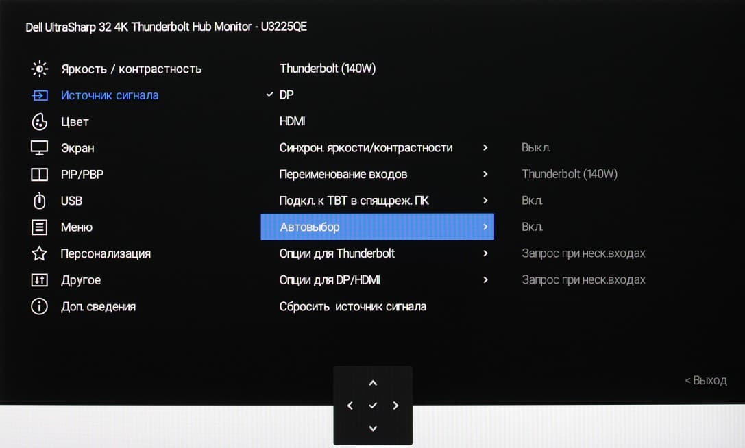 Представление об оснащенности интерфейсами дает таблица с характеристиками в начале статьи. Монитор имеет три цифровых входа, поддерживающих прием видеосигнала, — DisplayPort, HDMI и Thunderbolt 4. Выбор входа осуществляется вручную несколькими способами, также есть отключаемая функция автоматического поиска сигнала на входах.