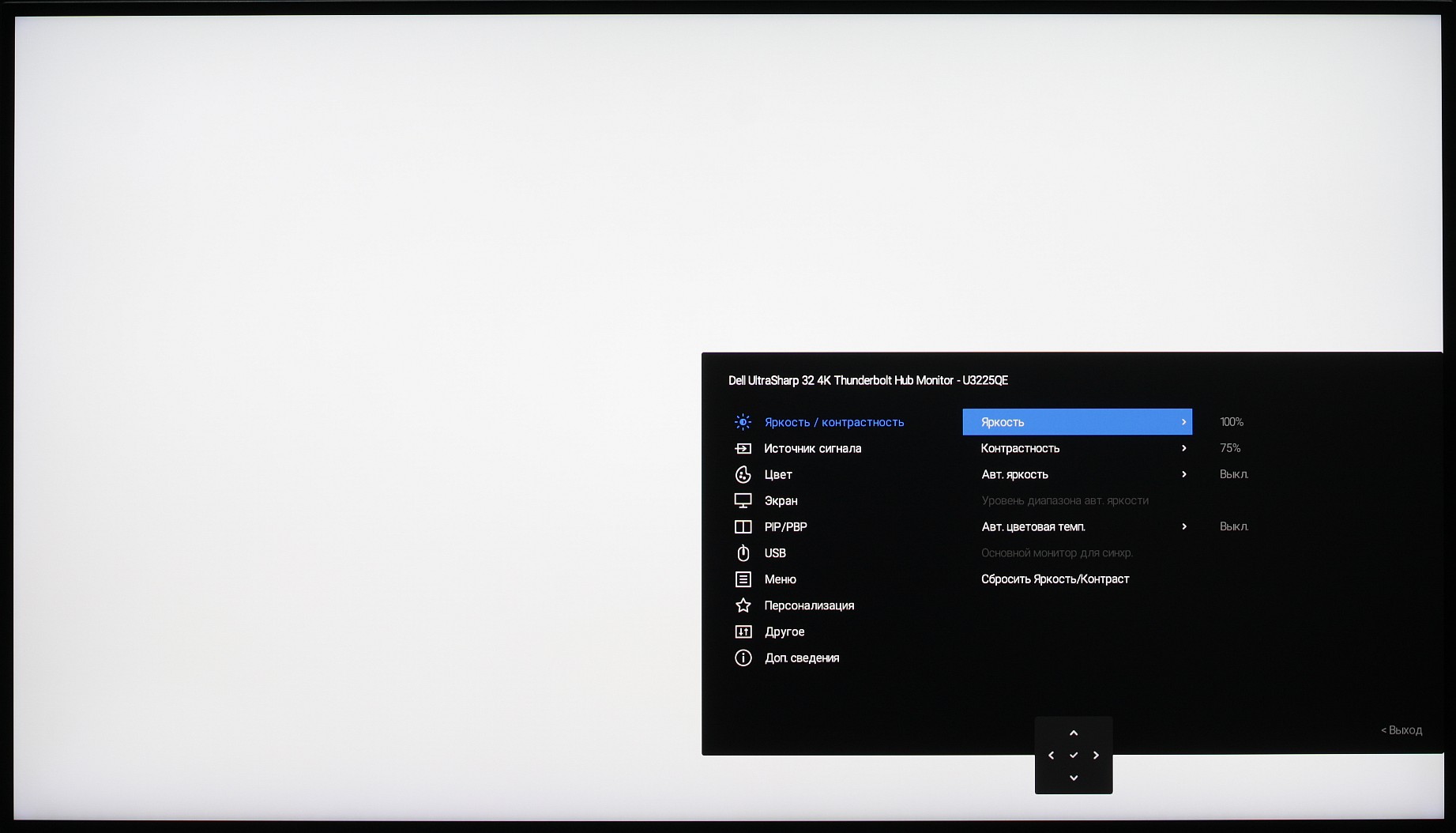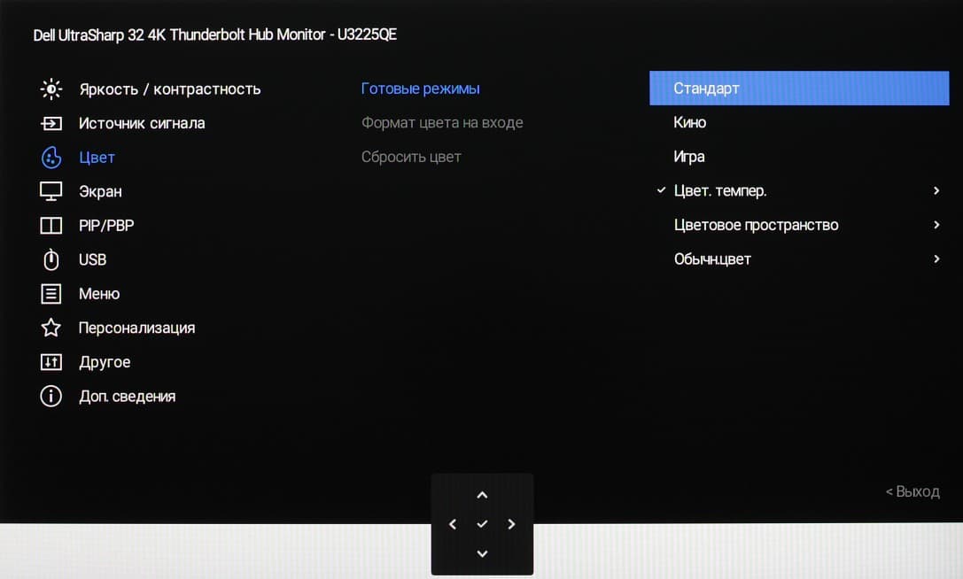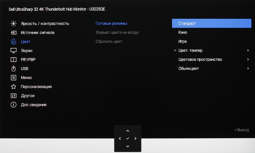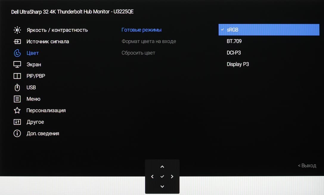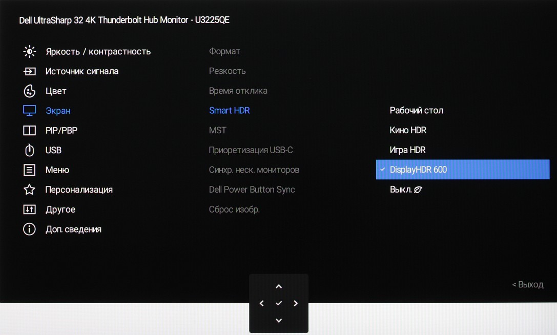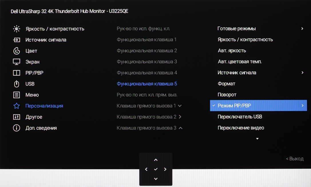 Представление об оснащенности интерфейсами дает таблица с характеристиками в начале статьи. Монитор имеет три цифровых входа, поддерживающих прием видеосигнала, — DisplayPort, HDMI и Thunderbolt 4. Выбор входа осуществляется вручную несколькими способами, также есть отключаемая функция автоматического поиска сигнала на входах.