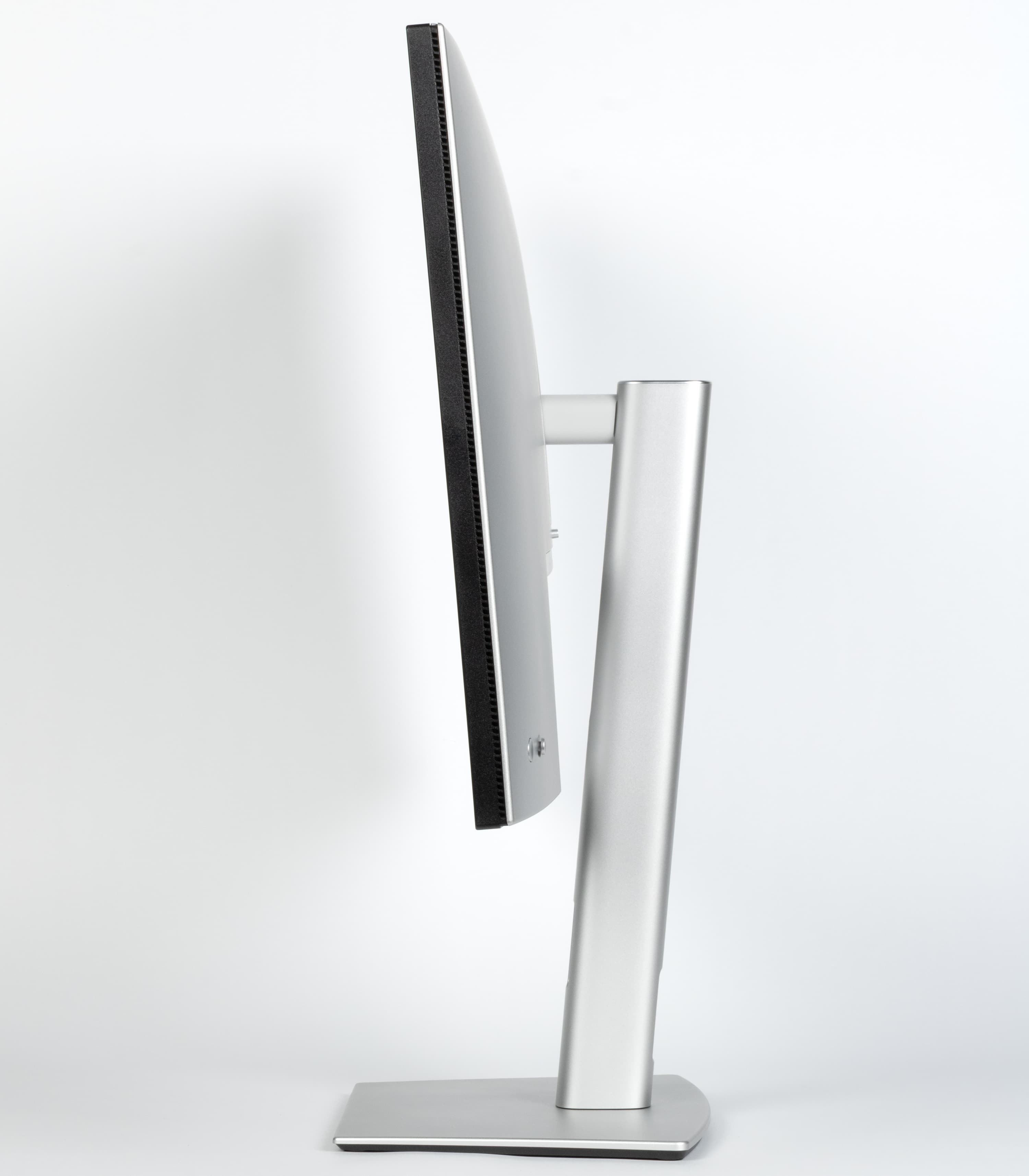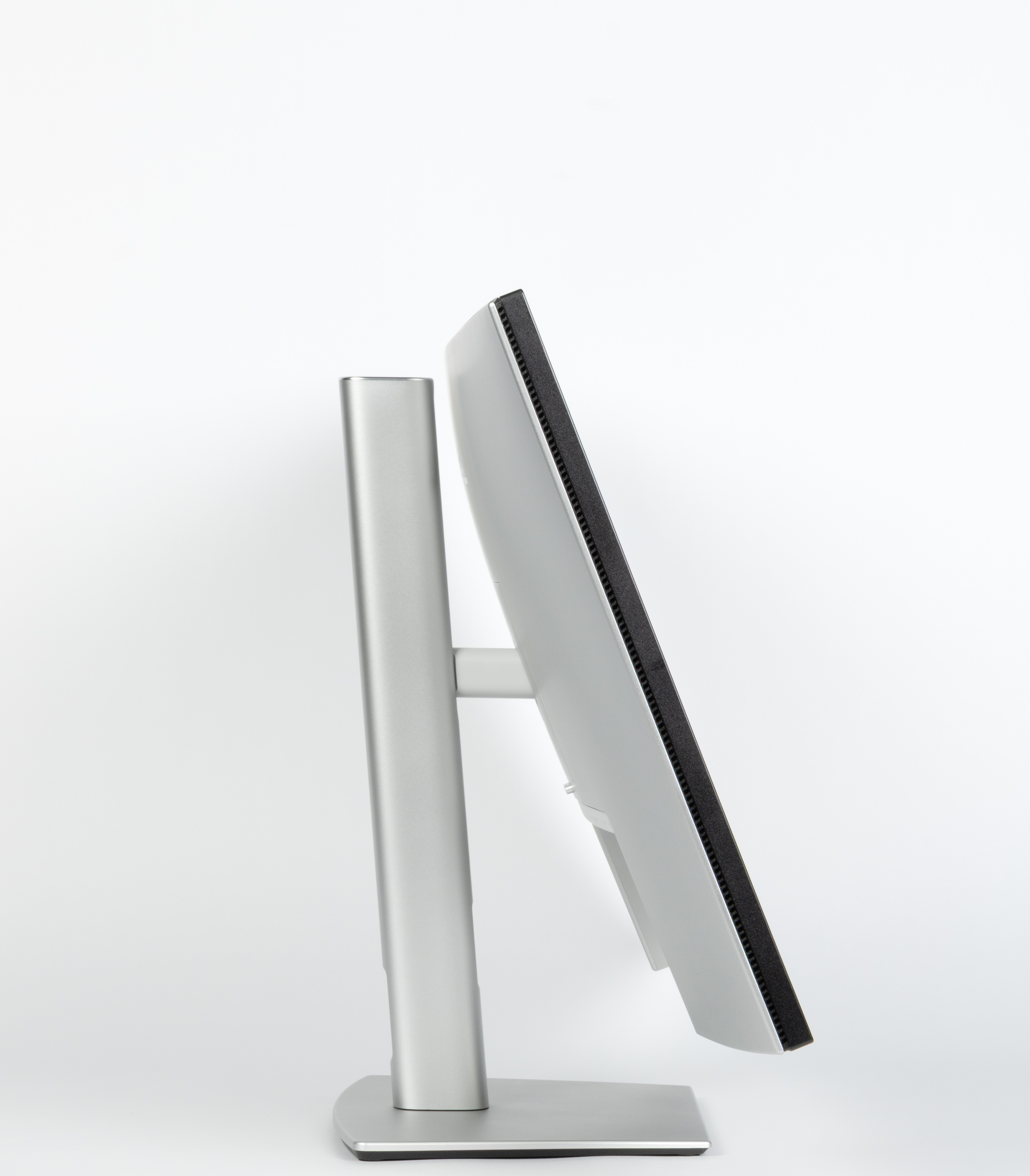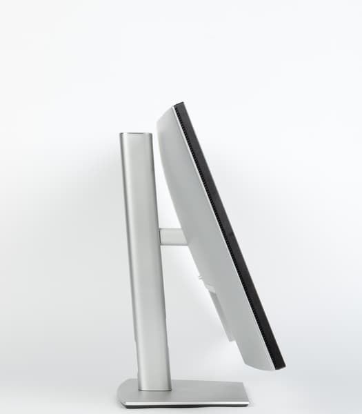 Стойка имеет фиксированную высоту, но подпираемый пружиной механизм с рельсовыми направляющими обеспечивает вертикальное перемещение узла, на который крепится блок экрана. В итоге экран можно установить на нужную высоту. Подставка позволяет наклонять блок экрана вперед от вертикального положения и больше наклонять назад, поворачивать вправо-влево, а также переворачивать в портретную ориентацию по и против часовой стрелки.