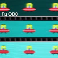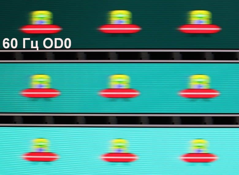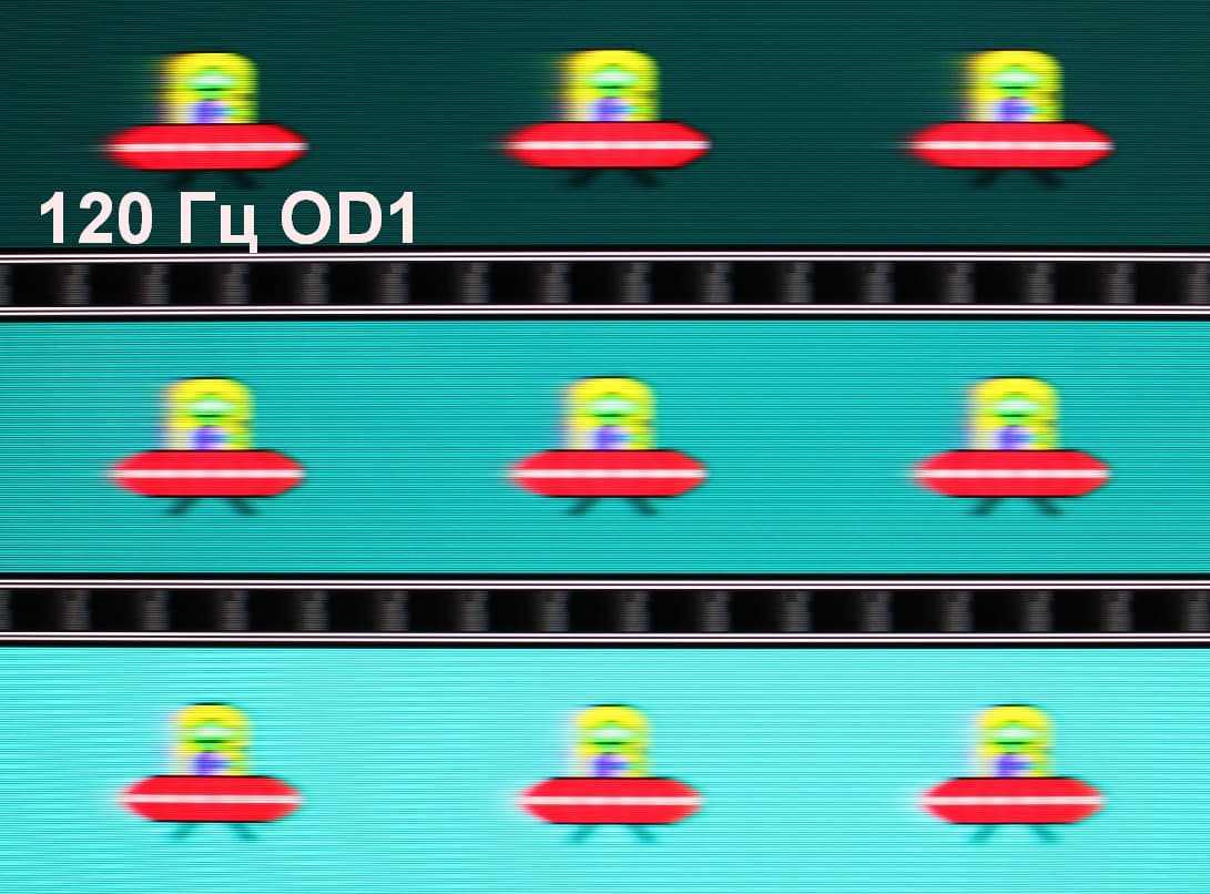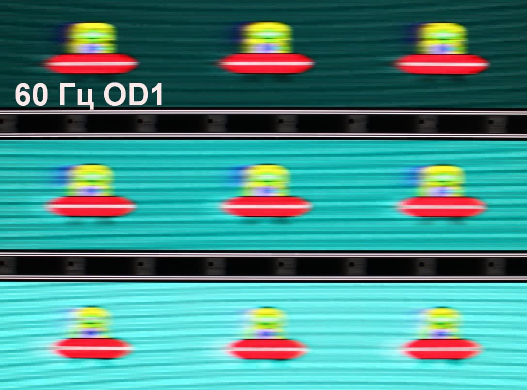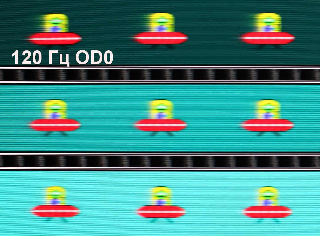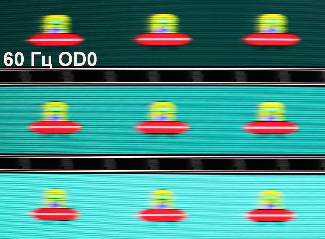 Для наглядного представления о том, что на практике означает такая скорость матрицы, и какие могут быть артефакты от разгона, приведем серию снимков, полученных с помощью движущейся камеры. Такие снимки показывают, что видит человек, если он следит глазами за двигающимся на экране объектом. Описание теста приведено тут, страница с самим тестом тут. Использовались рекомендованные установки (скорость движения 960 пиксель/с, выдержка 1/15 с). На фотографиях указаны значения частоты обновления, а также включен ли разгон (ODx; x = 0 — 1).