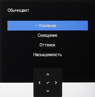 Индикатор питания при работе неярко светится белым (это можно отключить), в режиме ожидания — мигает белым и не горит, если монитор условно выключен. Когда монитор включен и на экране нет меню, то при отклонении джойстика вверх, вниз, вправо или влево на экран выводится ползунок или список/короткое меню той настройки, которая назначена пользователем на данное отклонение джойстика, включая запуск короткого меню.