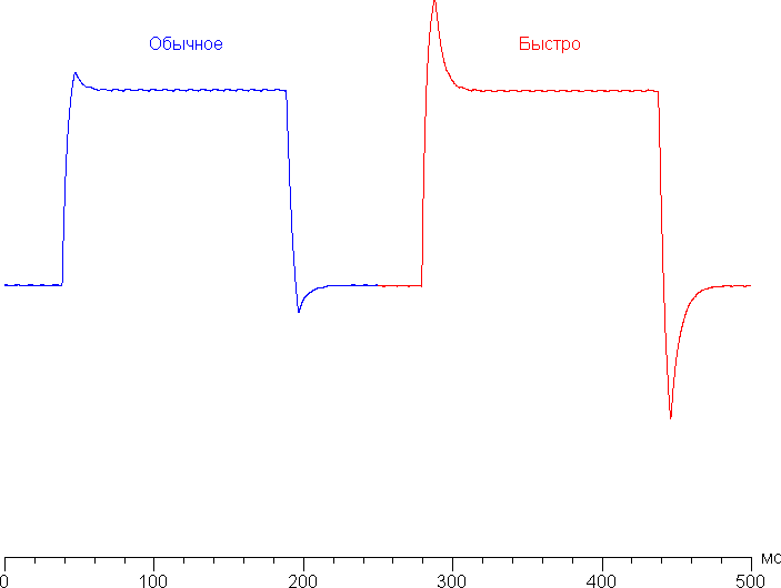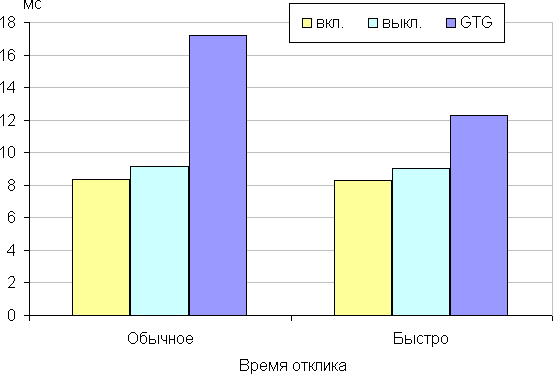 Время отклика зависит от значения одноименной настройки (два значения), которая управляет разгоном матрицы. График ниже показывает, как меняется время включения и выключения при переходе черный-белый-черный (столбики «вкл.» и «выкл.»), а также среднее суммарное время для переходов между полутонами (столбики GTG):