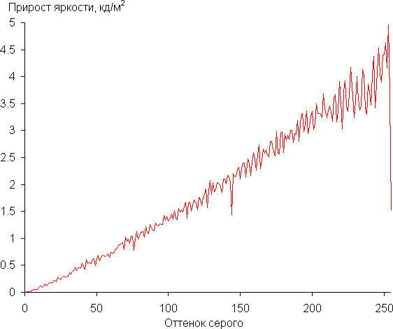 Мы измерили яркость 256 оттенков серого (от 0, 0, 0 до 255, 255, 255). График ниже показывает прирост (не абсолютное значение!) яркости между соседними полутонами: