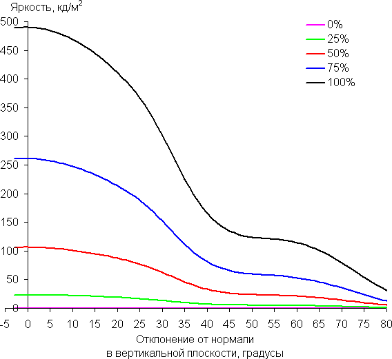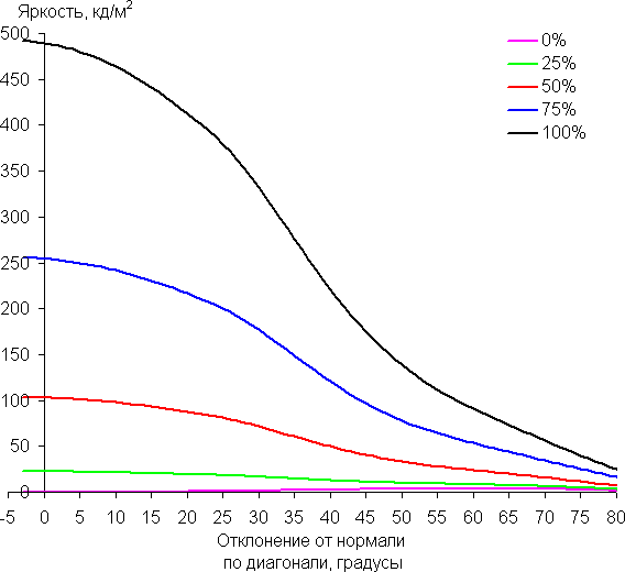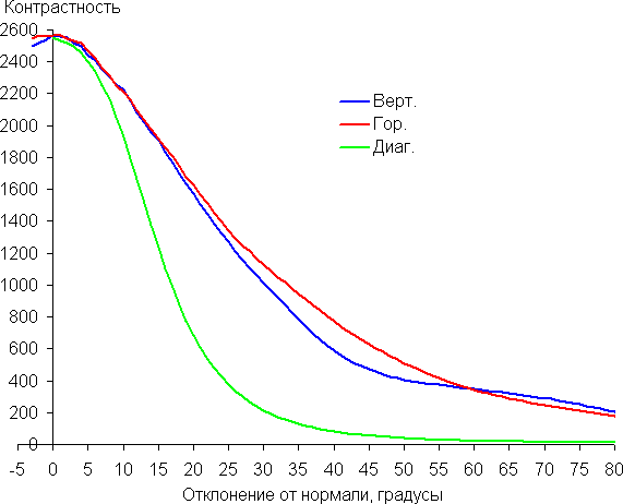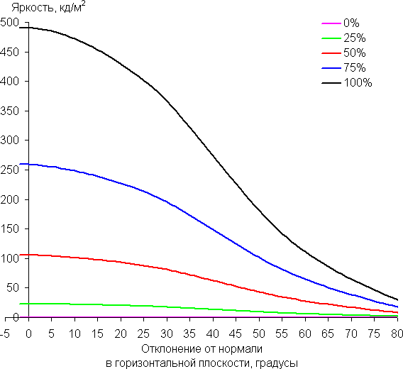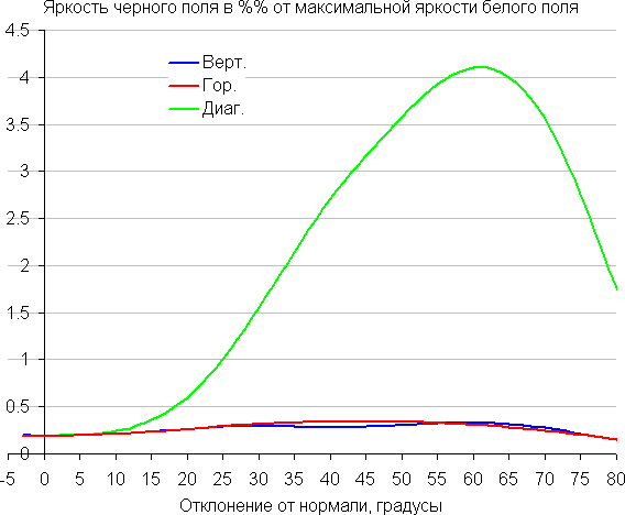 Углы обзора по снижению яркости относительно широкие. При отклонении в диагональном направлении яркость черного поля начинает резко возрастать уже при 20°-30° отклонения от перпендикуляра к экрану, и возрастает максимум до примерно 4% от максимальной яркости белого поля. Даже для матрицы типа IPS это очень высокое значение. Если сидеть не очень далеко от экрана, то черное поле по углам будет заметно светлее, чем в центре, и иметь желтоватый оттенок. Контрастность в диапазоне углов ±82° приближается к отметке 10:1 только при отклонении по диагонали, но все равно остается выше этого значения.