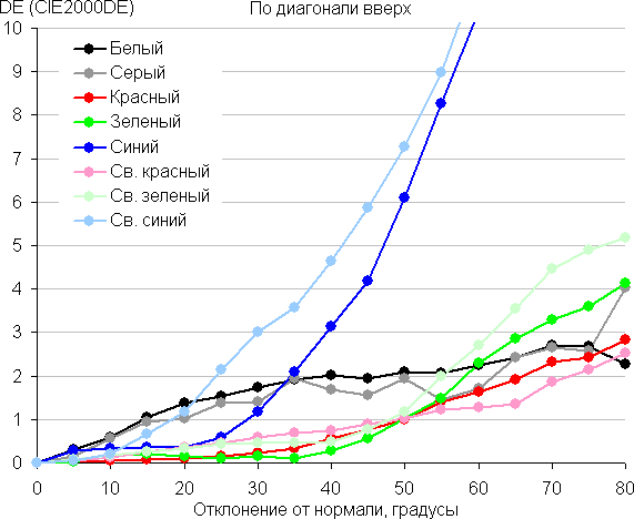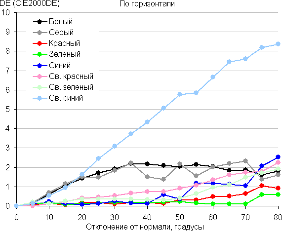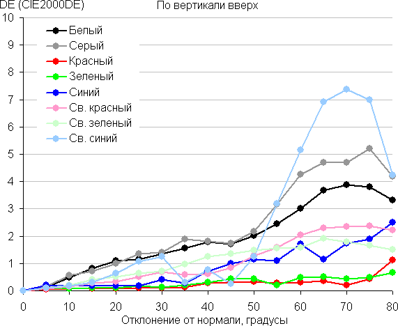 Для количественной характеристики изменения цветопередачи мы провели колориметрические измерения для белого, серого (127, 127, 127), красного, зеленого и синего, а также светло-красного, светло-зеленого и светло-синего полей во весь экран с использованием установки, подобной той, что применялась в предыдущем тесте. Измерения проводились в диапазоне углов от 0° (датчик направлен перпендикулярно к экрану) до 80° с шагом в 5°. Полученные значения интенсивностей были пересчитаны в ΔE относительно замера каждого поля при перпендикулярном положении датчика относительно экрана. Результаты представлены ниже: