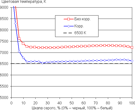Самый близкий к черному диапазон можно не учитывать, так как в нем цветопередача не так важна, а погрешность измерения цветовых характеристик высокая. Цветовой баланс во всех двух случаях хороший, так как цветовая температура достаточно близка к стандартным 6500 К и отклонение от спектра абсолютно черного тела (ΔE) ниже 3 единиц. При этом оба параметра мало изменяются на различных участках шкалы серого, что улучшает визуальное восприятие цветового баланса. Простой корректировкой цветовой баланс удается улучшить до уровня профессиональных моделей.