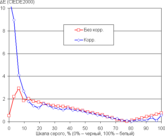 Графики ниже показывают цветовую температуру на различных участках шкалы серого и отклонение от спектра абсолютно черного тела (параметр ΔE) в случае отсутствия какой-либо коррекции (подписано — Без корр.) и после коррекции цветового баланса (100/98/95 для усиления красного/зеленого/синего — Корр.):