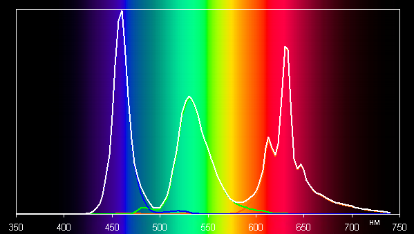Ниже приведен спектр для белого поля (белая линия), наложенный на спектры красного, зеленого и синего полей (линии соответствующих цветов) в случае исходного цветового охвата: