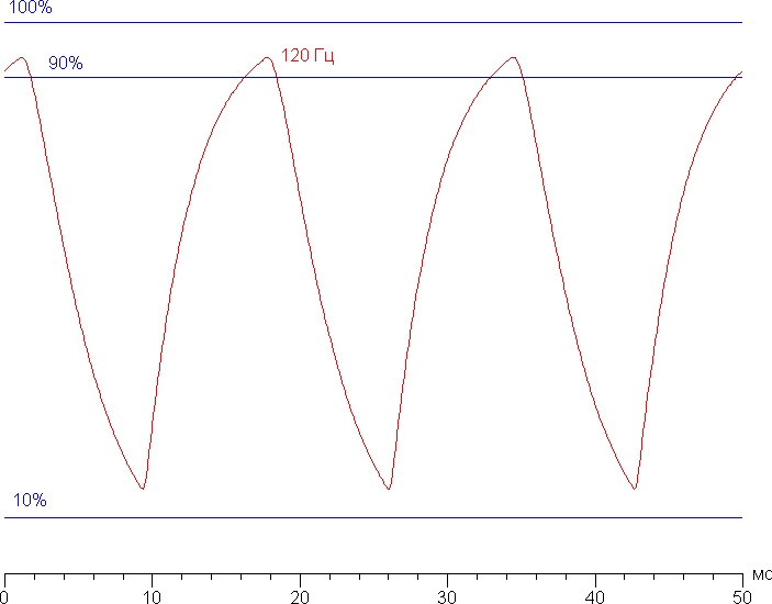 Приведем зависимости яркости при чередовании белого и черного кадра при 120 Гц кадровой частоты (график с подписью 120 Гц):