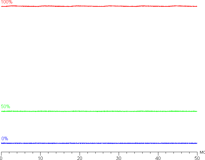 На любом уровне яркости модуляция подсветки отсутствует, что исключает видимое мерцание экрана. Для тех, кто привык распознавать знакомое сокращение, уточним: ШИМ отсутствует. В доказательство приведем графики зависимости яркости (вертикальная ось) от времени (горизонтальная ось) при различных значениях настройки яркости: