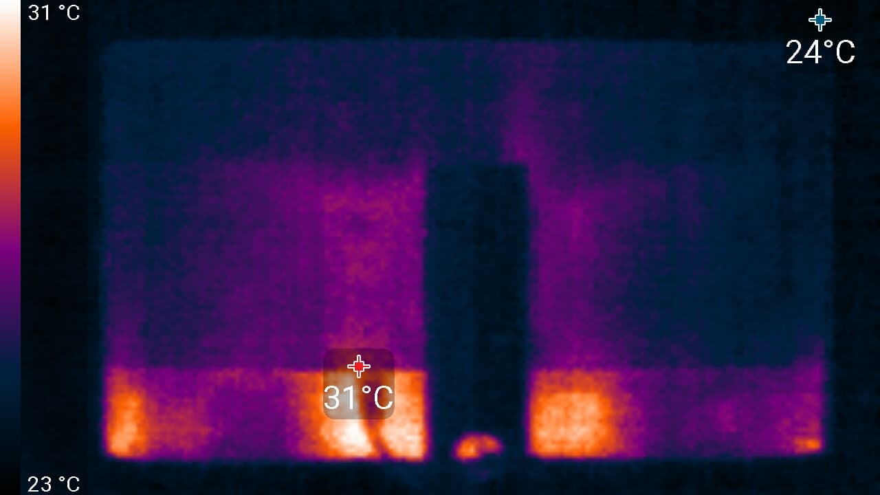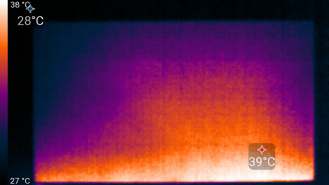 Нижний край экрана нагрелся до 39 °C максимум. Видимо, внизу находится светодиодная линейка подсветки экрана. Нагрев сзади умеренный.