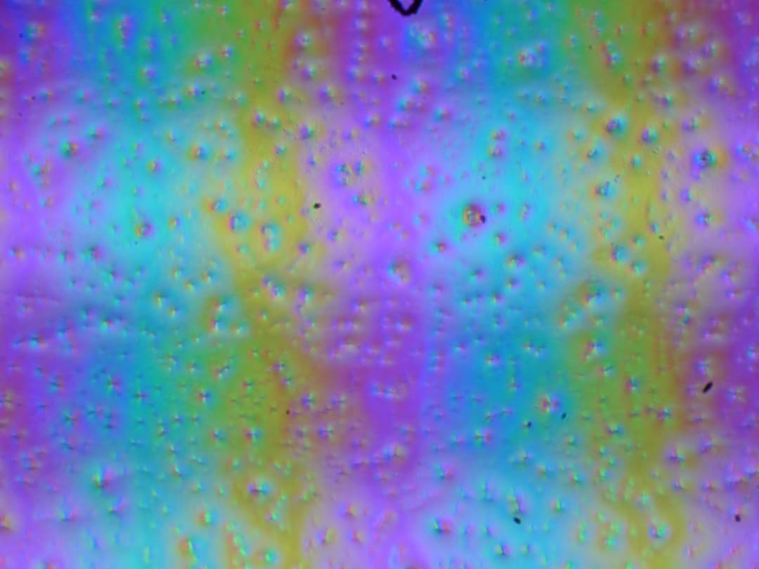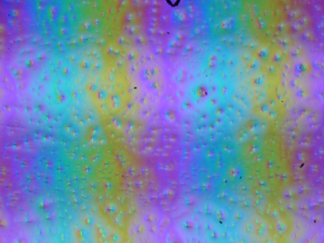 Зерно этих дефектов в несколько раз меньше размеров субпикселей (масштаб этих двух фотографий одинаковый), поэтому фокусировка на микродефектах и «перескок» фокуса по субпикселям при изменении угла зрения выражены слабо, из-за этого нет и «кристаллического» эффекта.