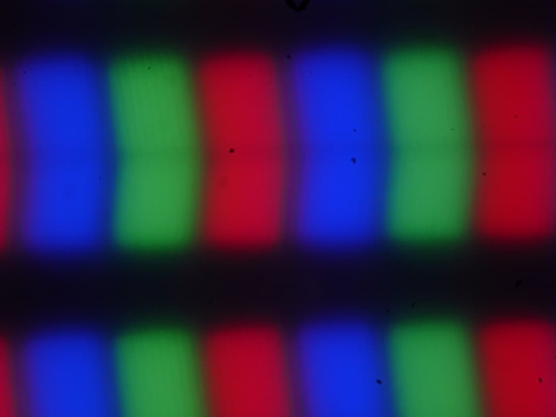 Из-за матовой поверхности экрана четкого изображения пикселей получить не удалось (черные точки — это пыль на матрице фотоаппарата), однако характерная для IPS структура субпикселей просматривается: