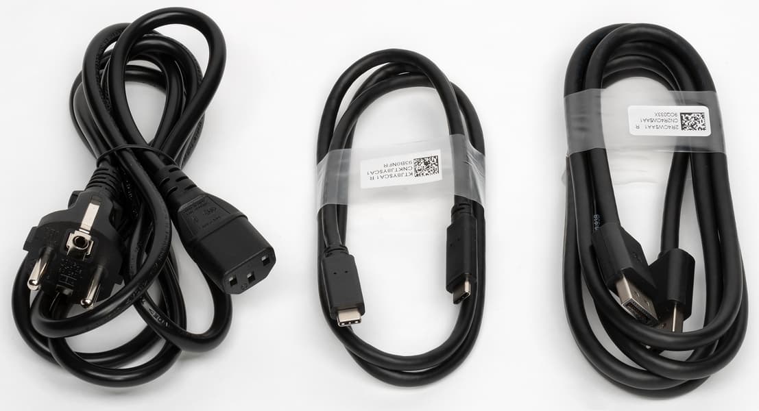 Производитель приложил к монитору всего три кабеля. Кабель DisplayPort без защелок на разъемах, что хорошо, но он, как и кабель USB-C относительно жесткие, а второй кабель также совсем не длинный, что уже не очень хорошо.