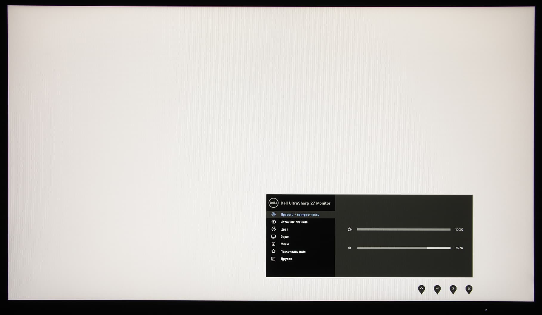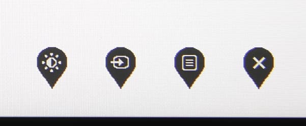 Индикатор питания при работе неярко светится белым (отключается в меню), в режиме ожидания — медленно и плавно мигает белым и не горит, если монитор условно (механического выключателя питания, к сожалению, нет) выключен. Когда на экране нет меню, то при первом нажатии на кнопки на экран выводится стартовое меню в виде четырех значков точно над кнопками.