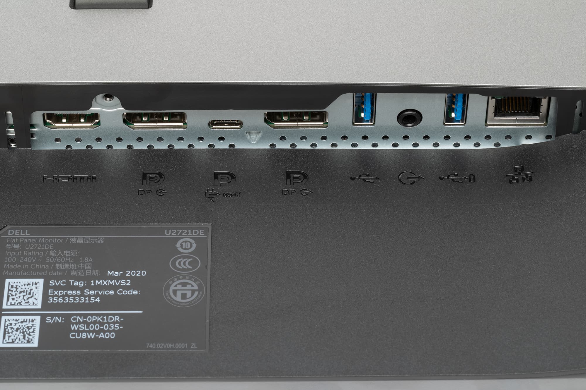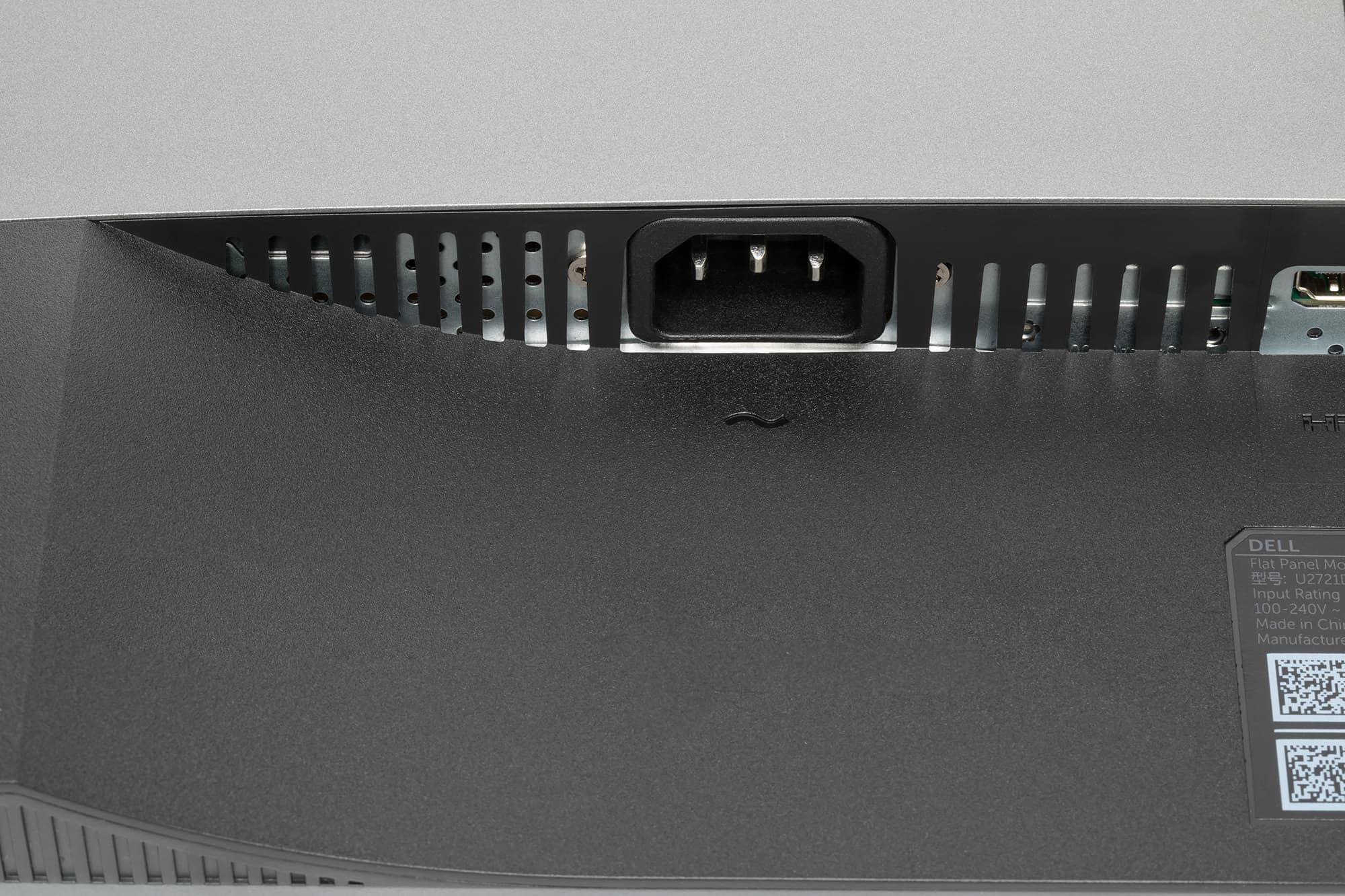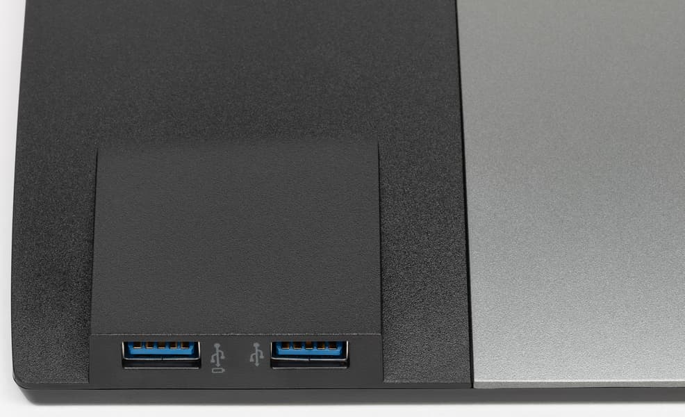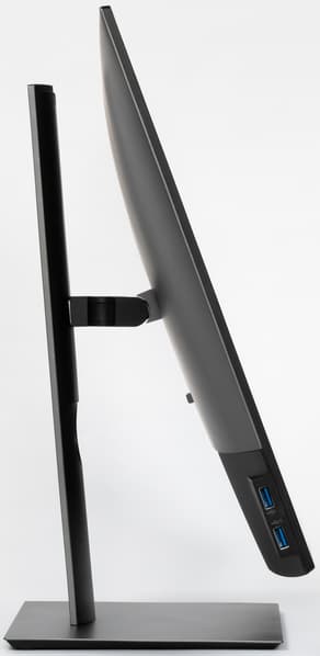 Разъем питания и большинство интерфейсных разъемов размещены в неглубокой незамкнутой нише на задней панели и ориентированы вниз. Подключаться к этим разъемам в обычном положении блока экрана неудобно, но его можно повернуть в портретную ориентацию, что существенно облегчает доступ к разъемам. Кроме того, на задней панели можно обнаружить разъем для кенсингтонского замка. Для удобства оперативного подключения USB-устройств два USB-порта вынесены на левый торец ближе к нижнему краю. На нижнем и на верхнем торцах блока экрана, а также в нише с разъемами есть вентиляционные решетки.