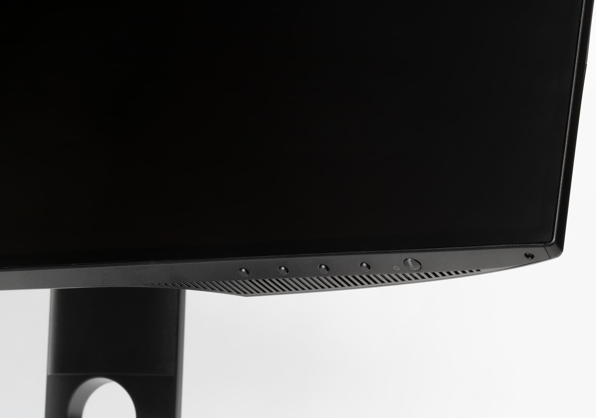 На нижнем торце ближе к правому краю расположены механические кнопки управления и кнопка питания, совмещенная с индикатором состояния. Никаких обозначений и меток нет, кнопки приходится находить на ощупь. Впрочем, при выводе меню метки кнопок на экране есть, что упрощает процесс настройки монитора.