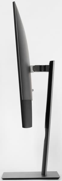Тонкая стойка подставки (видимо, применена пружина особой геометрии), компактный узел крепления блока экрана, относительно малая толщина блока экрана, сочетание плоских и выпуклых поверхностей, а также строгая цветовая гамма в целом производят благоприятное сочетание — монитор выглядит аккуратно и умеренно стильно. Отметим, что узкие поля, расположение кнопок и возможность поворота по и против часовой стрелки делают более комфортным использование установленных встык мониторов в том числе и в портретной ориентации.