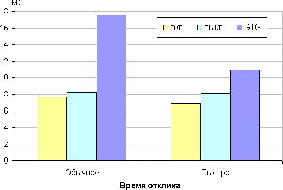 Время отклика зависит от значения настройки Время отклика, которая управляет разгоном матрицы. Ступени регулировки две. Диаграмма ниже показывает, как меняется время включения и выключения при переходе черный-белый-черный (столбики «вкл.» и «выкл.»), а также среднее суммарное время для переходов между полутонами (столбики GTG):