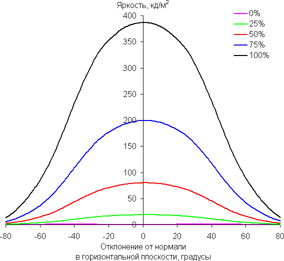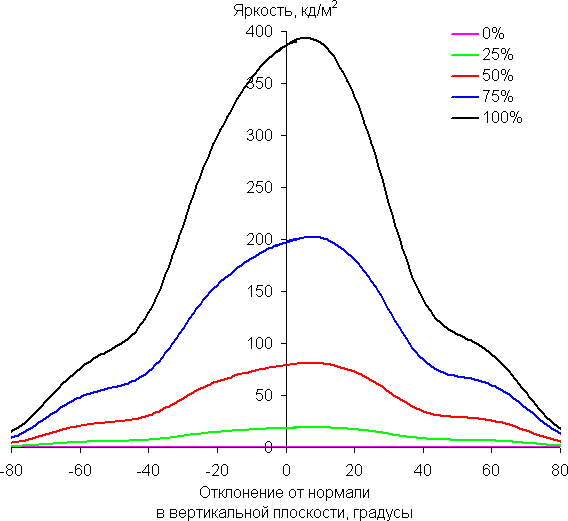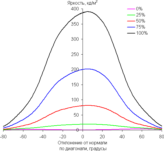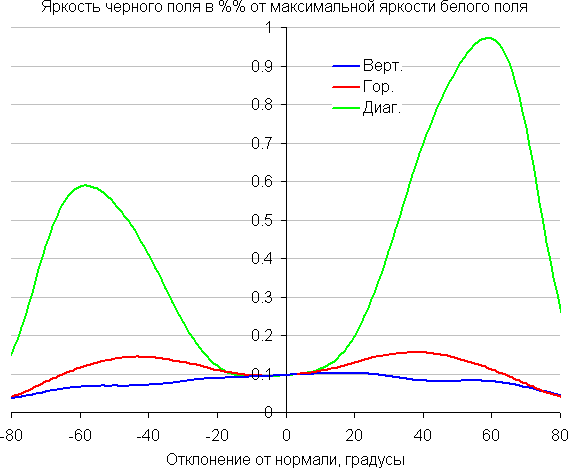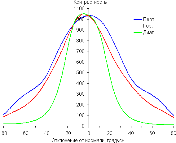 Отметим медленное уменьшение яркости при отклонении от перпендикуляра к экрану в горизонтальном направлении в довольно широком диапазоне углов, при этом графики не пересекаются во всем диапазоне измеряемых углов. Заметно быстрее падает яркость при отклонении в вертикальном направлении. При отклонении в диагональном направлении поведение яркости оттенков имеет промежуточный характер между вертикальным и горизонтальным направлениями, за исключением яркости черного поля, которая начинает резко возрастать уже при 20°-30° отклонения от перпендикуляра к экрану. Если сидеть от экрана на расстоянии 50-60 см, то черное поле по углам будет заметно светлее, чем в центре. Контрастность в диапазоне углов ±82° в случае отклонения по диагонали приближается к отметке 10:1, но не опускается ниже.