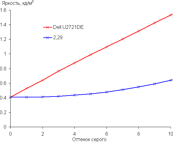Рост прироста яркости более-менее равномерный, и каждый следующий оттенок значимо ярче предыдущего, даже в самой темной области. При этом в темной области наблюдается почти линейный рост яркости, что близко к требованием стандарта sRGB: