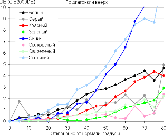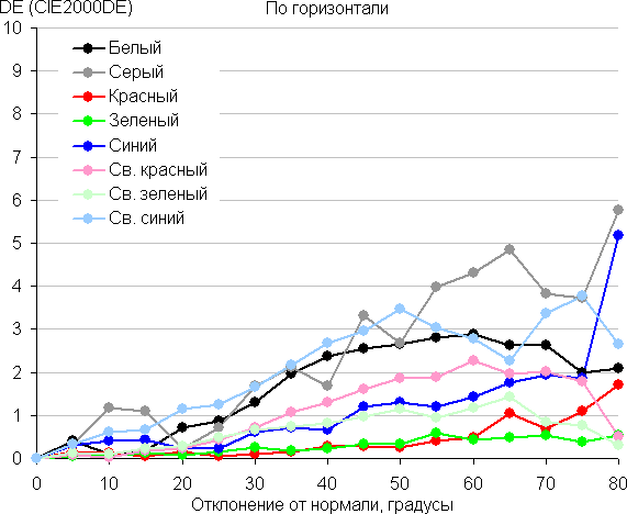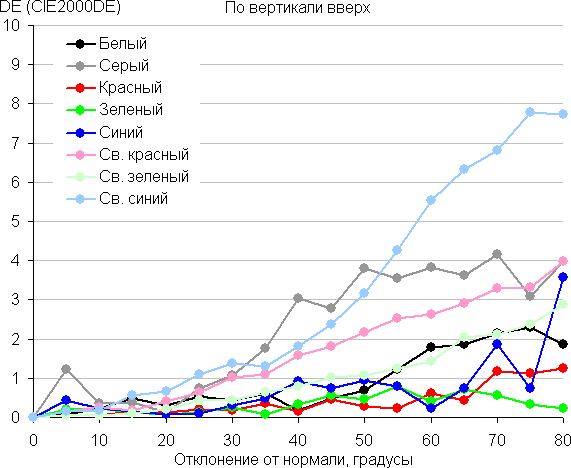 Для количественной характеристики изменения цветопередачи мы провели колориметрические измерения для белого, серого (127, 127, 127), красного, зеленого и синего, а также светло-красного, светло-зеленого и светло-синего полей во весь экран с использованием установки, подобной той, что применялась в предыдущем тесте. Измерения проводились в диапазоне углов от 0° (датчик направлен перпендикулярно к экрану) до 80° с шагом в 5°. Полученные значения интенсивностей были пересчитаны в ΔE относительно замера каждого поля при перпендикулярном положении датчика относительно экрана. Результаты представлены ниже: