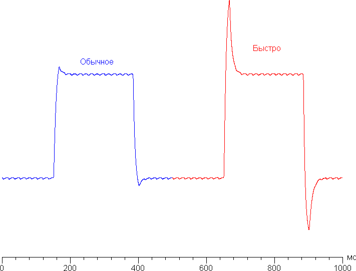 Ниже приведены графики полутонового перехода между оттенками 40% и 60% и обратно при различных значениях настройки Время отклика (по вертикали — яркость, по горизонтали — время, для наглядности графики выстроены последовательно):