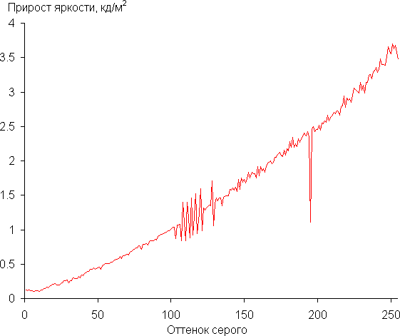 Для оценки характера роста яркости на шкале серого мы измерили яркость 256 оттенков серого (от 0, 0, 0 до 255, 255, 255). График ниже показывает прирост (не абсолютное значение!) яркости между соседними полутонами: