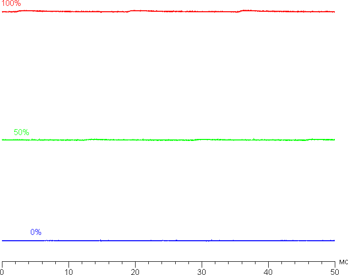 На любом уровне яркости значимая модуляция подсветки отсутствует, что исключает видимое мерцание экрана. В доказательство приведем графики зависимости яркости (вертикальная ось) от времени (горизонтальная ось) при различных значениях настройки яркости: