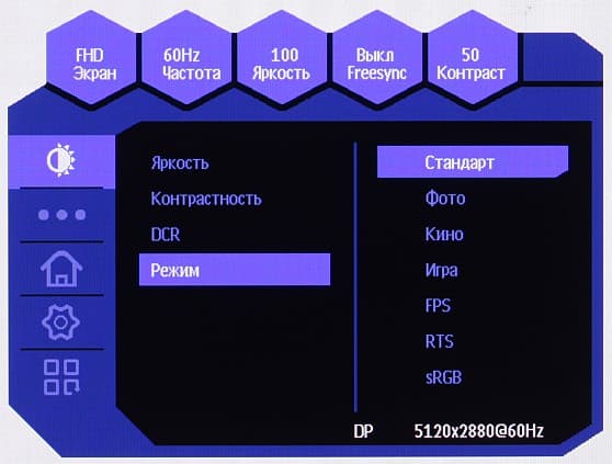 Индикатора питания мы не обнаружили. На нижнем торце есть что-то похожее на него, но ни в каких режимах это не светится. Включается монитор нажатием на джойстик, а выключается — длительным нажатием на джойстик. Когда монитор включен и на экране нет меню, то при отклонении джойстика вверх, вниз, вправо или влево на экран выводится ползунок или список/короткое меню четырех настроек — таймер с обратным отсчетом, выбор перекрестия прицела, выбор входа, выбор режима изображения.