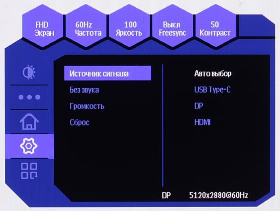 Монитор оснащен двумя цифровыми входами в полноразмерном варианте — DisplayPort и HDMI, — дополненные входом USB-C. Выбор входа осуществляется в основном меню установок или в меню быстрого доступа. Есть отключаемая функция автоматического поиска сигнала на входах.