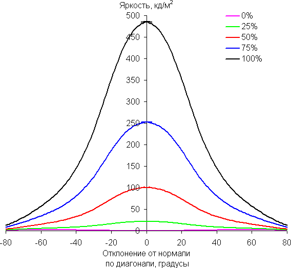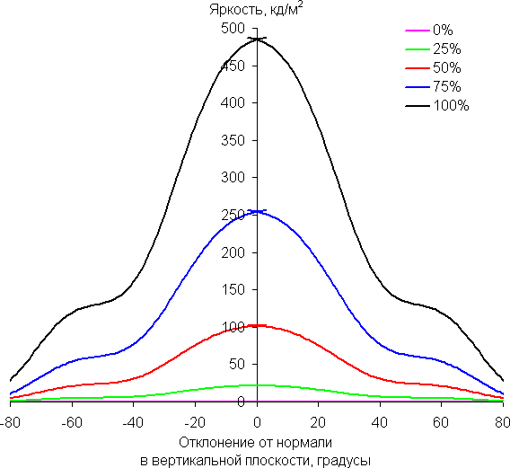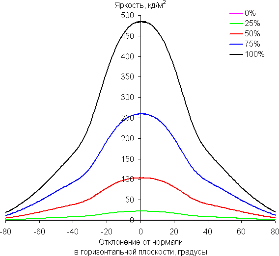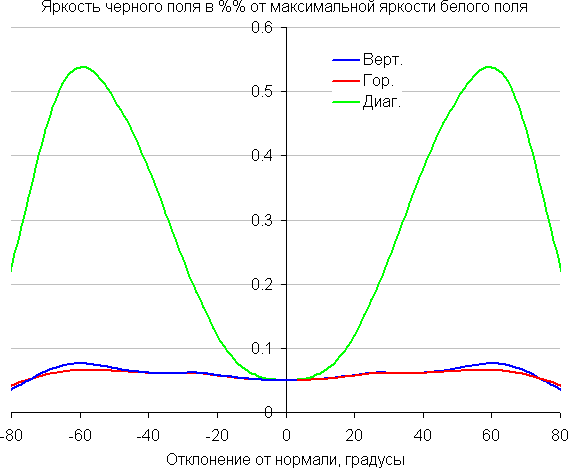 По скорости снижения яркости углы обзора неширокие, что для матрицы типа IPS нехарактерно. При отклонении в диагональном направлении яркость черного поля начинает резко возрастать уже при 20°-30° отклонения от перпендикуляра к экрану. Если сидеть не очень далеко от экрана, то черное поле по углам будет заметно светлее, чем в центре (приобретая слегка красноватый оттенок). Контрастность в диапазоне углов ±82° только в случае отклонения по диагонали приближается к отметке 10:1, но не опускается ниже.