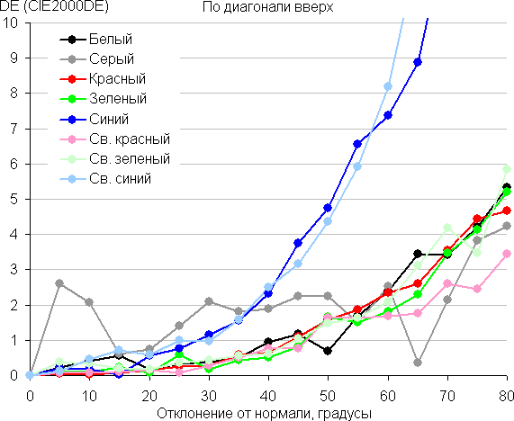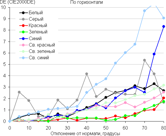 Для количественной характеристики изменения цветопередачи мы провели колориметрические измерения для белого, серого (127, 127, 127), красного, зеленого и синего, а также светло-красного, светло-зеленого и светло-синего полей во весь экран с использованием установки, подобной той, что применялась в предыдущем тесте. Измерения проводились в диапазоне углов от 0° (датчик направлен перпендикулярно к экрану) до 80° с шагом в 5°. Полученные значения интенсивностей были пересчитаны в ΔE относительно замера каждого поля при перпендикулярном положении датчика относительно экрана. Результаты представлены ниже: