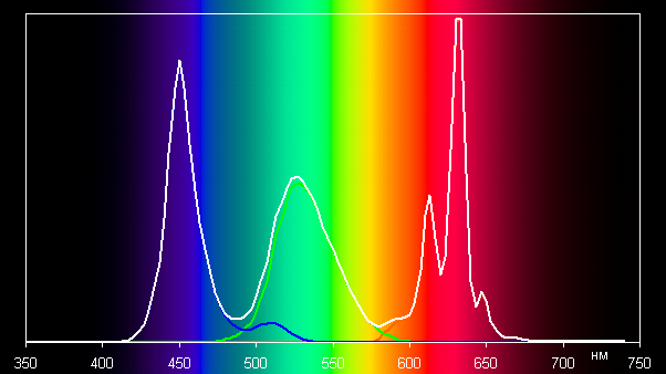 Можно предположить, что в светодиодах подсветки применяется синий излучатель и зеленый и красный люминофоры, при этом в красном люминофоре (а может и в зеленом) используются так называемые квантовые точки. Хорошее разделение компонент позволяет получить уширенный цветовой охват.