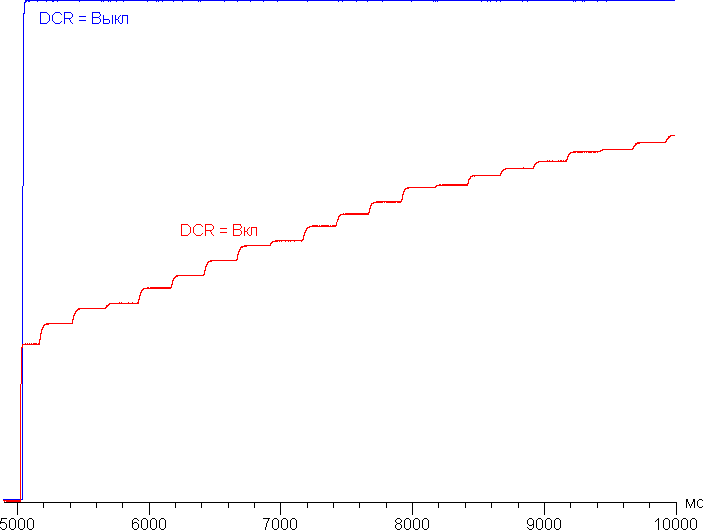 При включении режима DCR с динамическим управлением яркости установившаяся контрастность формально возрастает, но не до бесконечности, так как даже на черном поле во весь экран подсветка совсем не выключается. График ниже показывает, как увеличивается яркость (вертикальная ось) при переключении с черного поля (после пяти секунд вывода) на белое при выключенной и включенной динамической подстройке яркости: