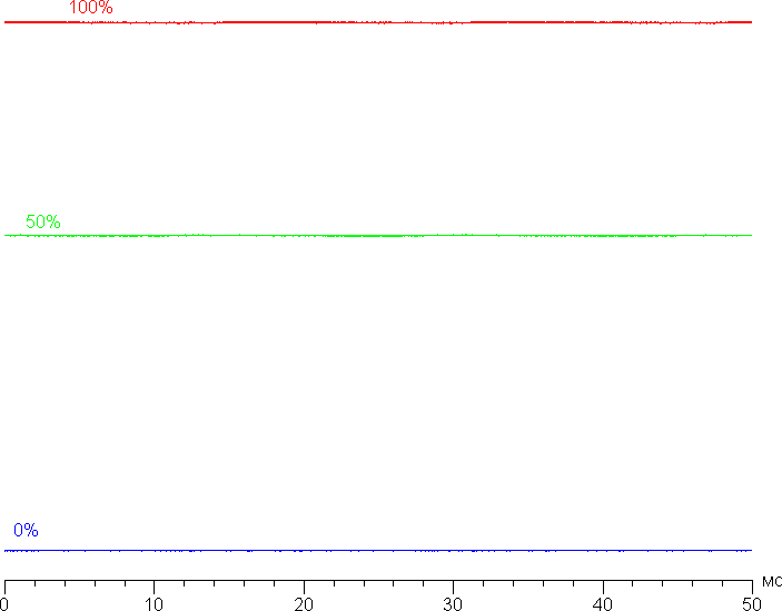 Яркость монитора меняется именно яркостью подсветки, то есть без ущерба для качества изображения (сохраняется контрастность и количество различимых градаций) яркость монитора можно менять в широких пределах, что позволяет с комфортом играть, работать и смотреть фильмы как в освещенном, так и в темном помещении. На любом уровне яркости значимая модуляция подсветки отсутствует, что исключает видимое мерцание экрана. Для тех, кто привык распознавать знакомое сокращение, уточним: ШИМ отсутствует. В доказательство приведем графики зависимости яркости (вертикальная ось) от времени (горизонтальная ось) при различных значениях настройки яркости: