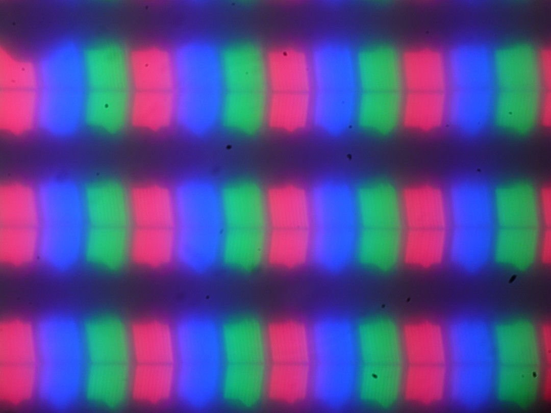Изображение структуры пикселей из-за матовой поверхности размыто, но характерную для IPS структуру распознать можно (черные точки — это пыль на матрице фотоаппарата):